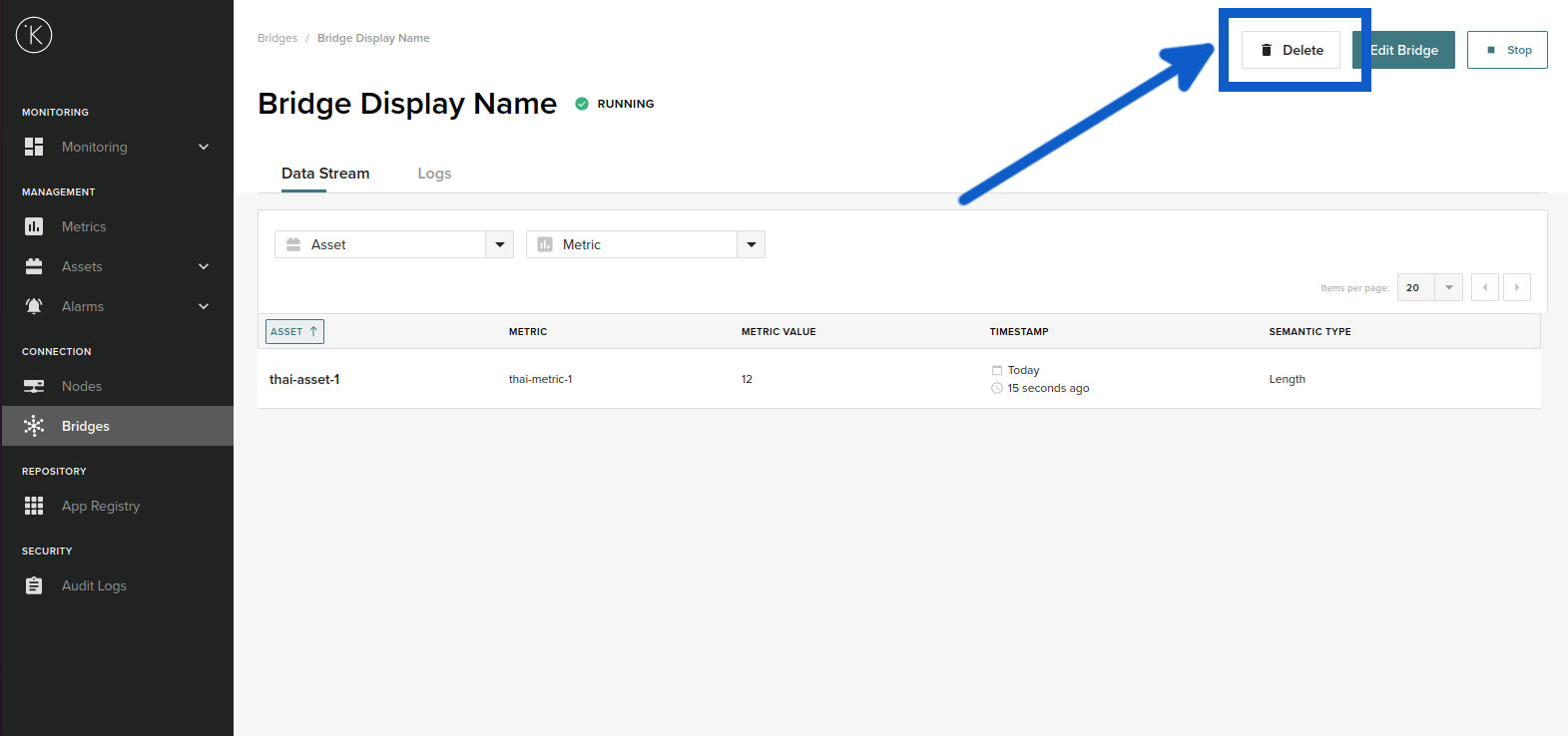 You will see the bridge details and all Assets being collected through this MQTT bridge. Click on Delete.