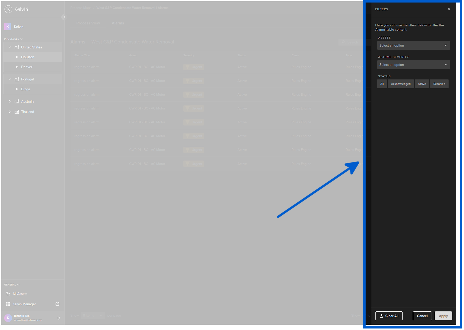 The alarm list overview has a number of useful features for moving around Kelvin Maps quickly and to quickly isolate the alarms most interesting to you.