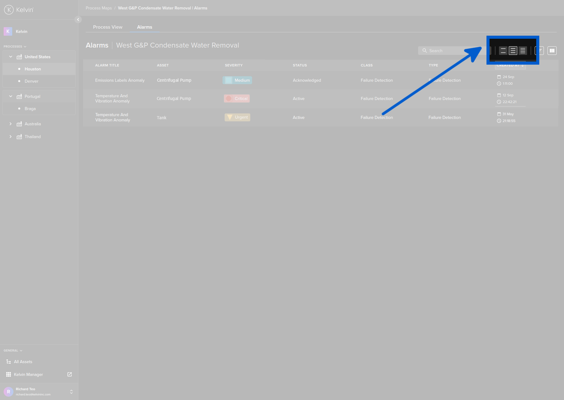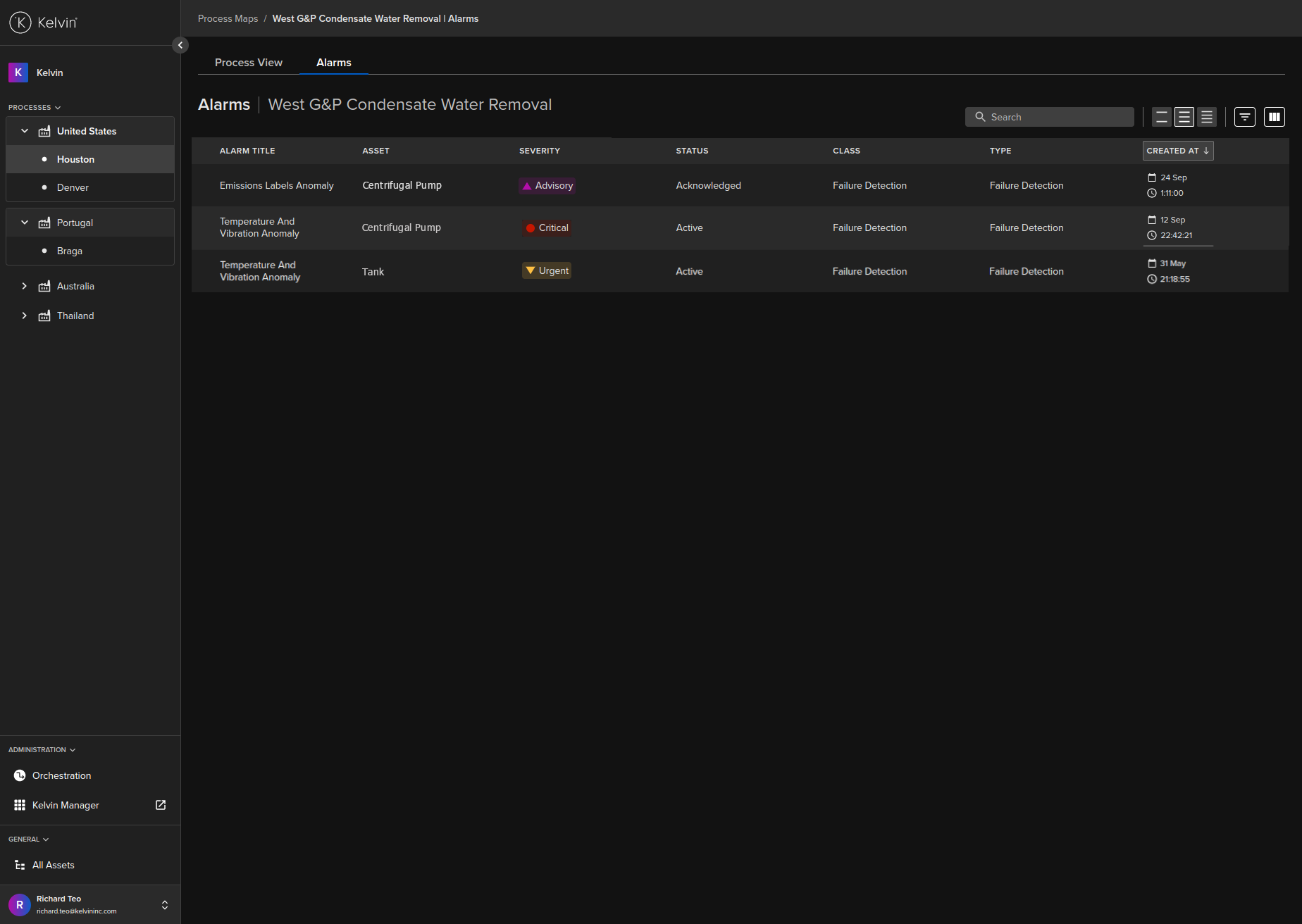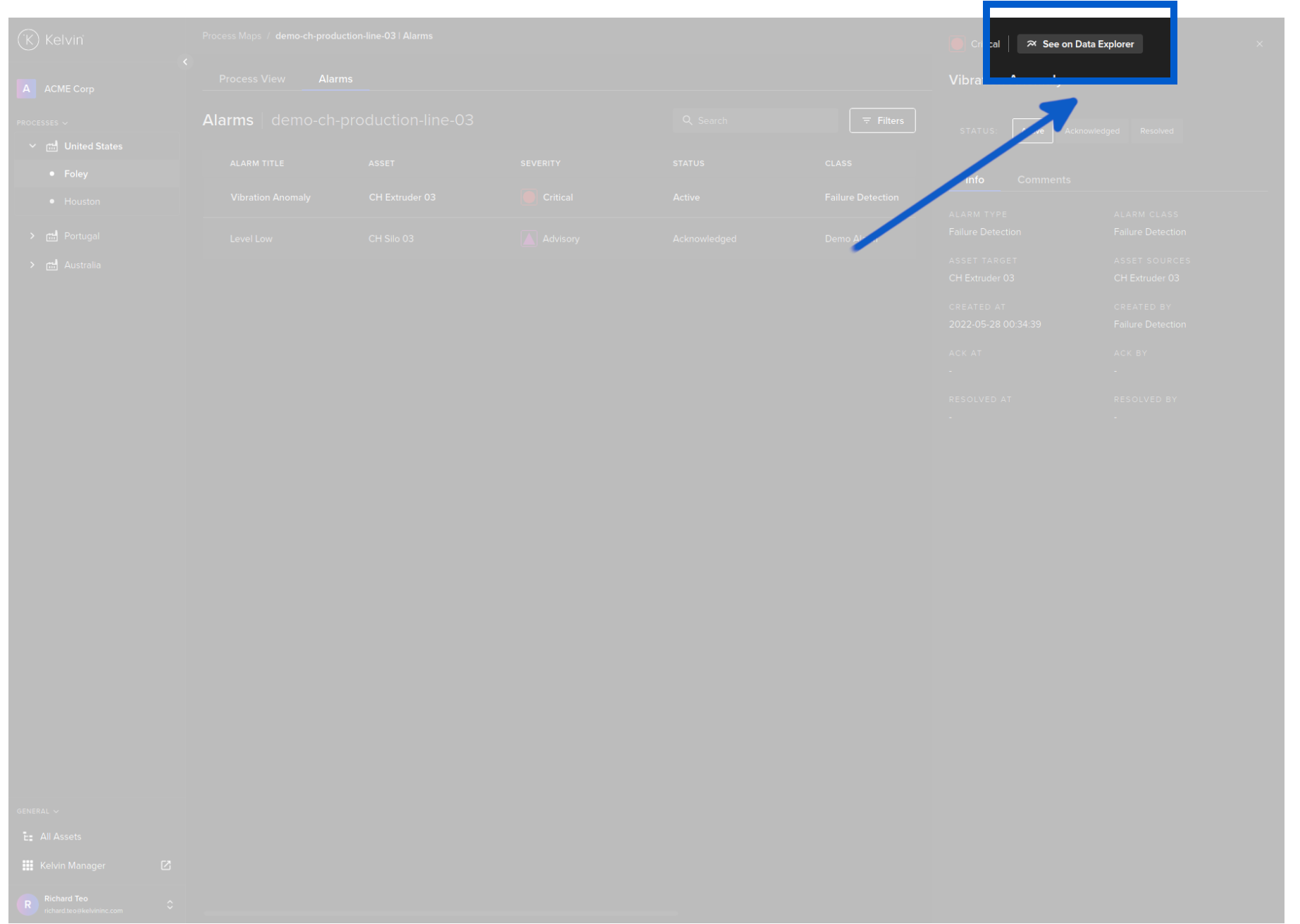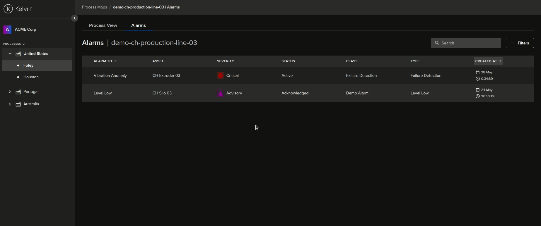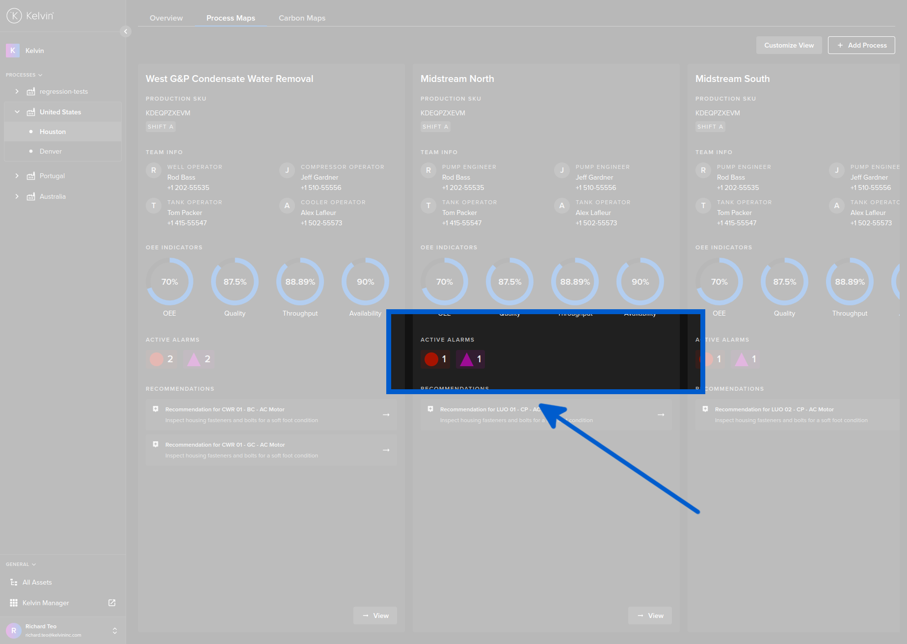 To see the details of the alarms in the Kelvin Maps Process Maps, click on the Alarms tab at the top;