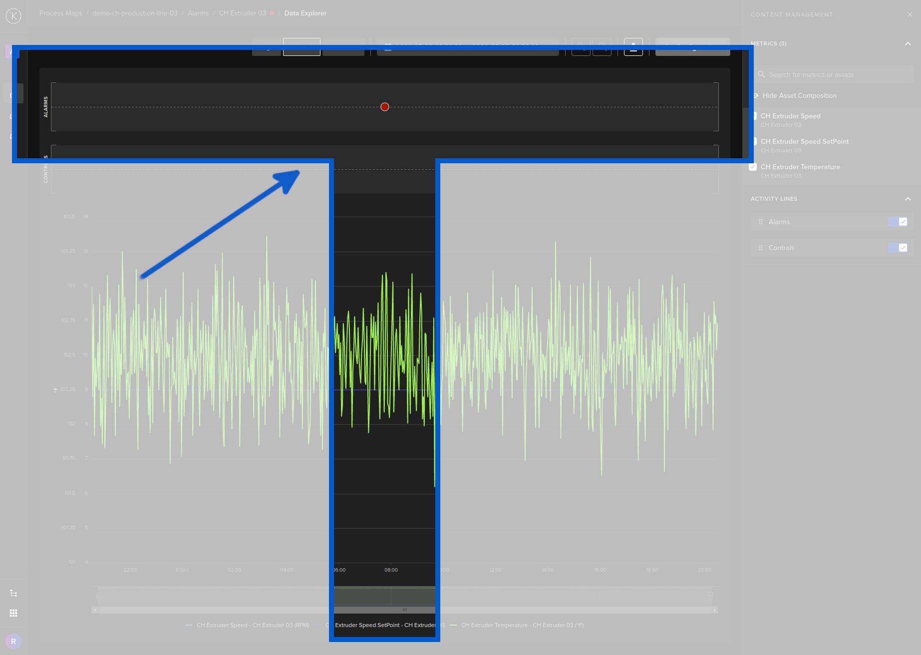 At the top you will see a button that links directly to the time when the Alarm occurred.