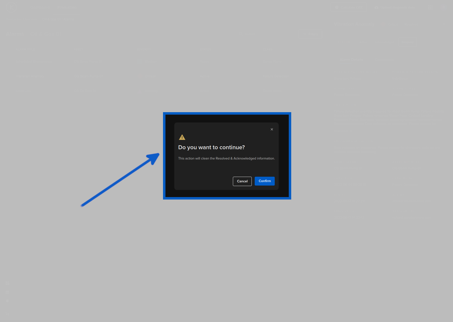 When you change status from acknowledge to resolve, there will be no confirmation dialog. The Alarm will immediately turn to Resolved status. You can always reverse this action, see the instructions further down.