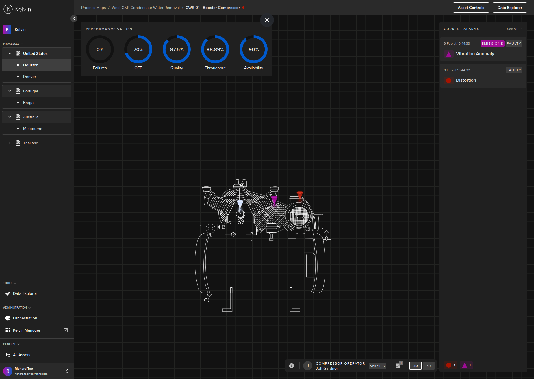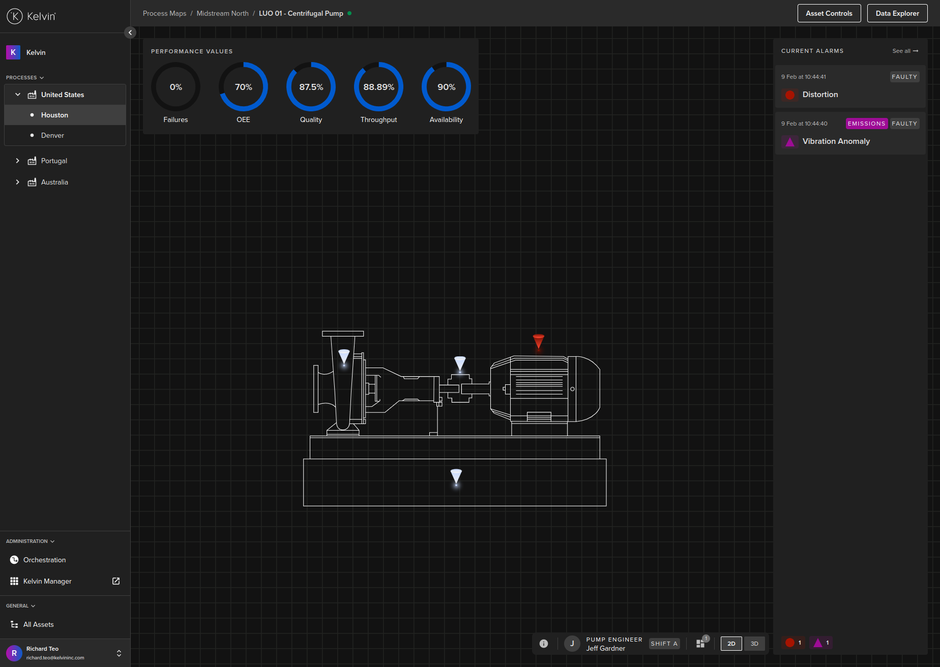 The color of the pins on the asset model represent the severity of the Kelvin Alarm. If it is white, then it means that there is no alarm at this monitoring Kelvin Component.