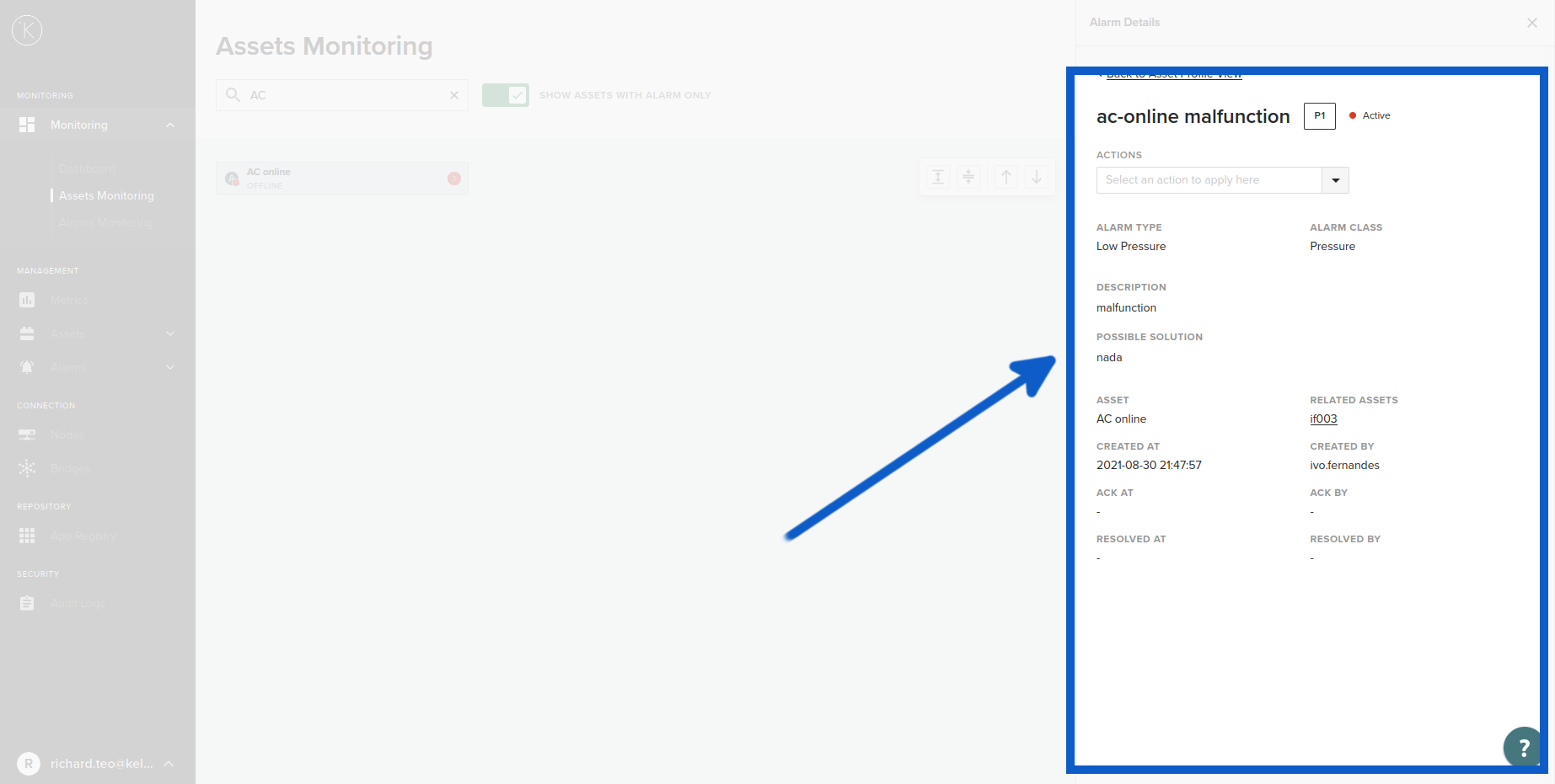 This list will only appear if there are any alarms associated with this Asset. They will be displayed as a list in the Last alarms section located just under the Asset details.