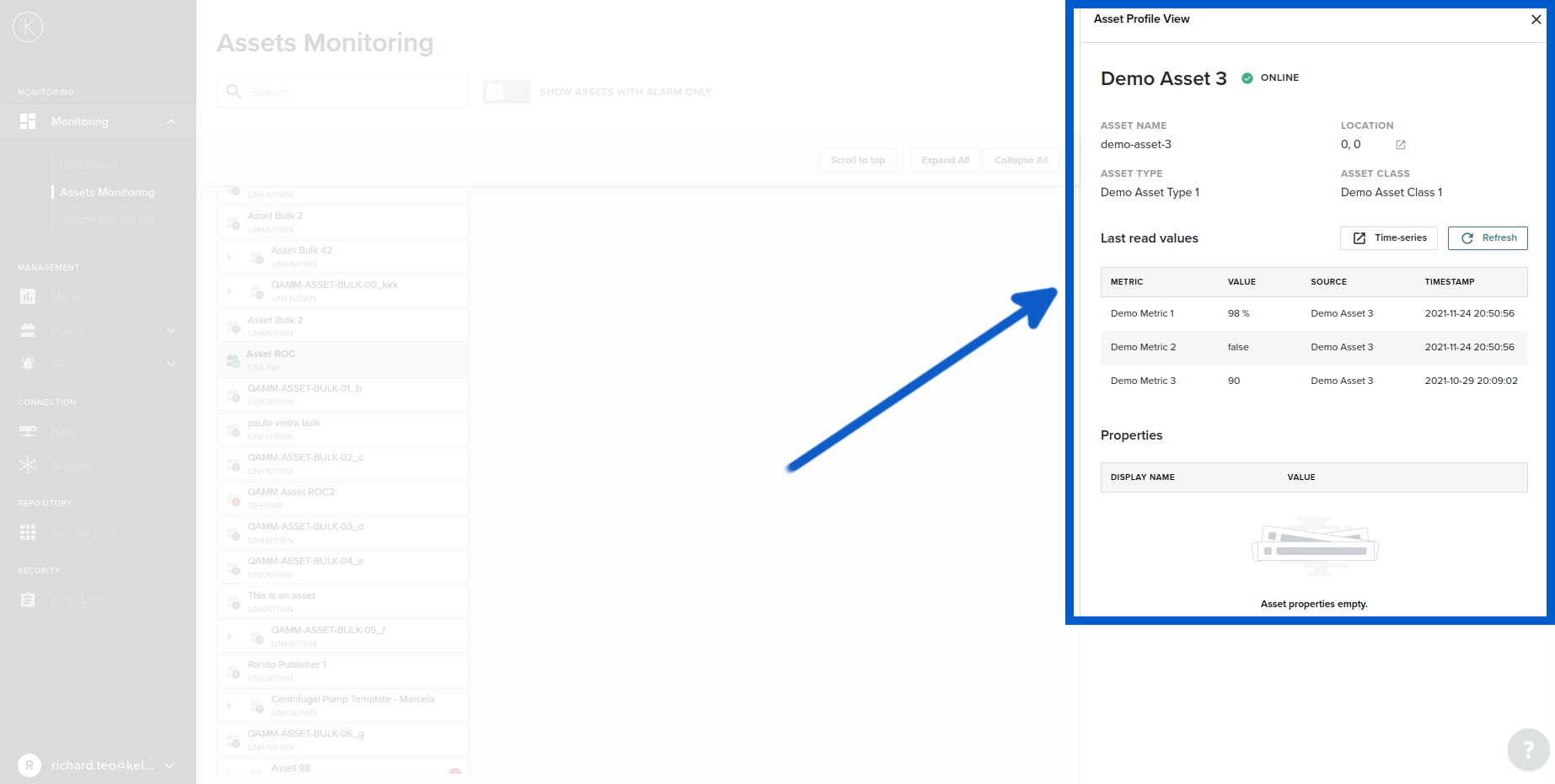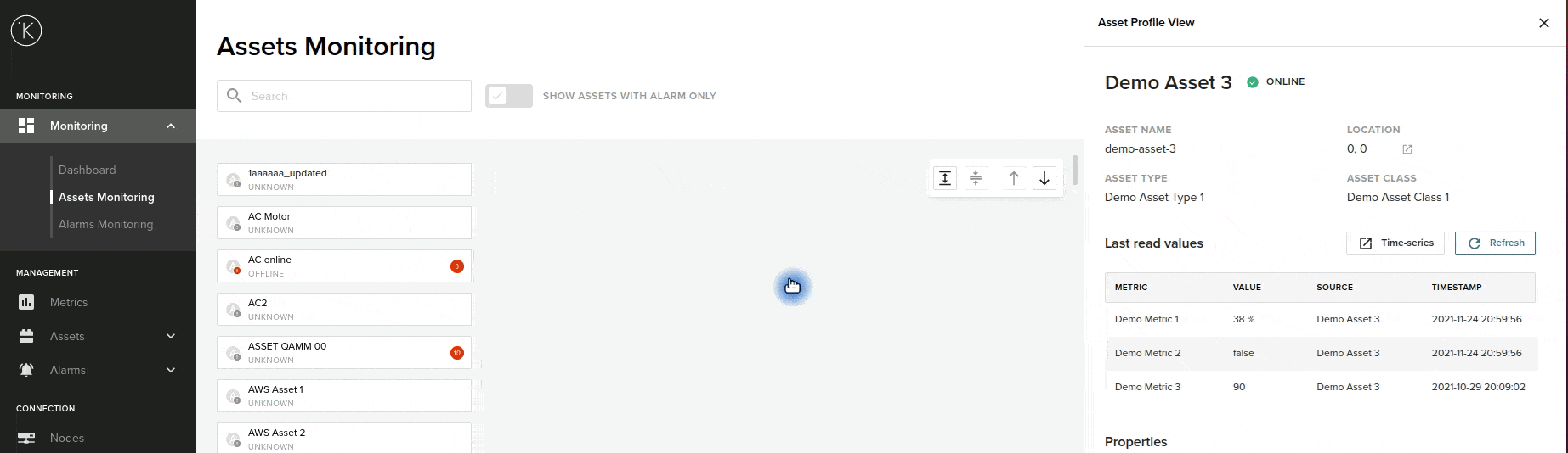 In the profile view you can see a summary of the Asset, its current status, its last read value of all the metrics connected to the selected Asset.