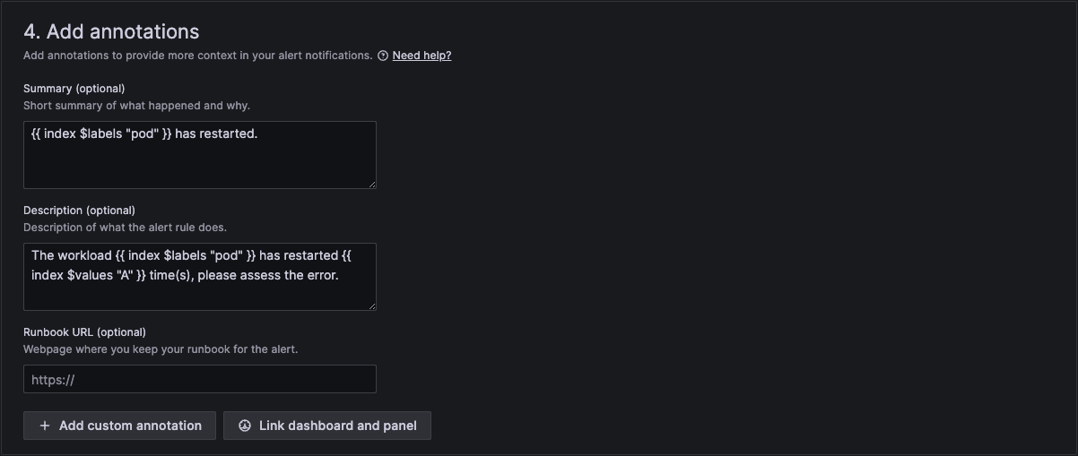 In section 4 we then add a standard summary text that will be sent in the alert. The curly brackets are the variables that will be replaced with the actual text of the workload and number of restarts.