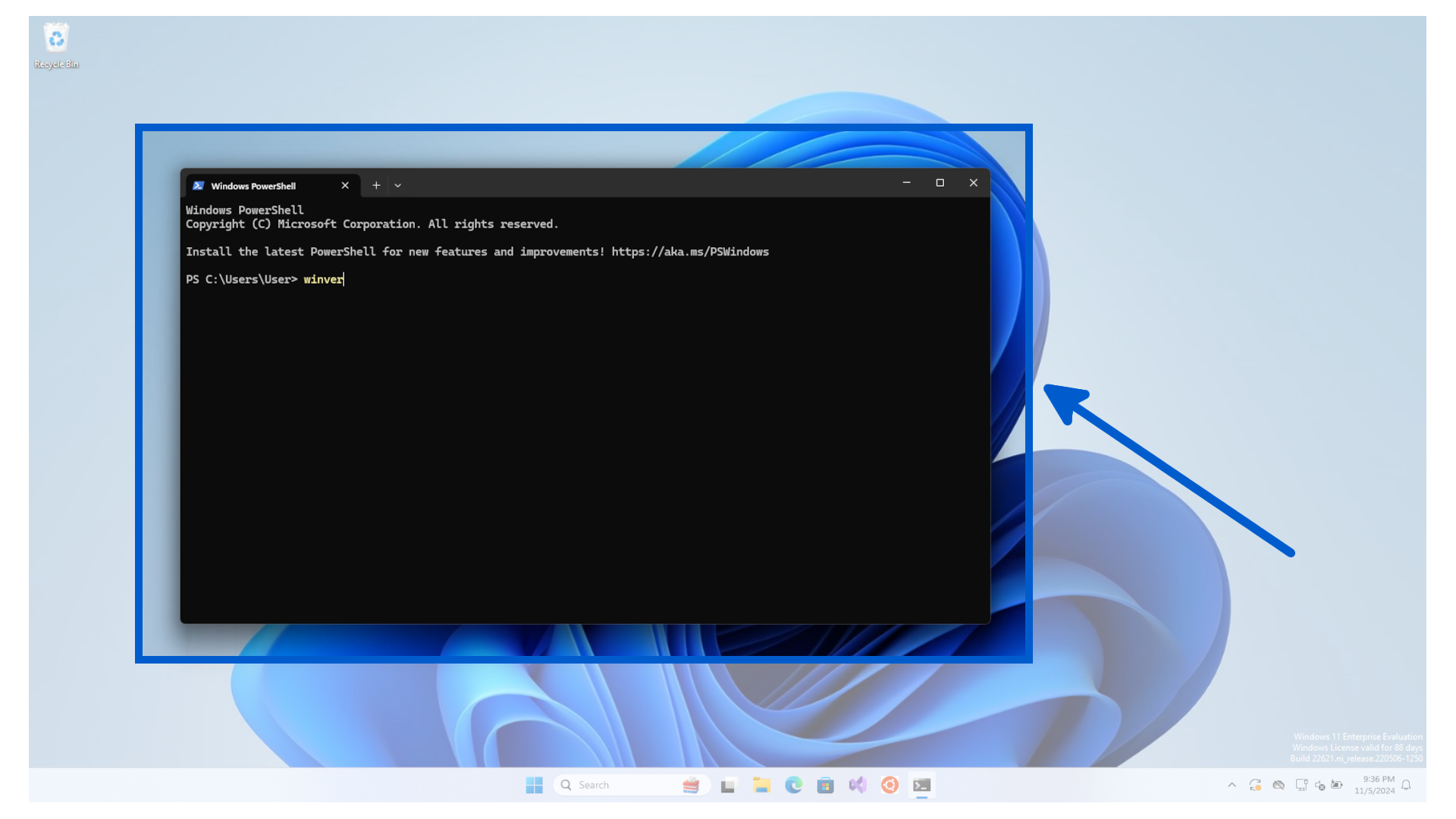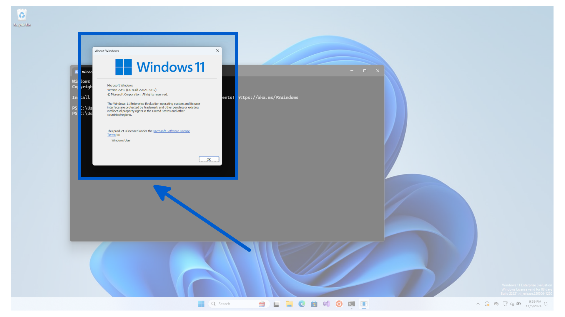 Then type winver into the terminal.