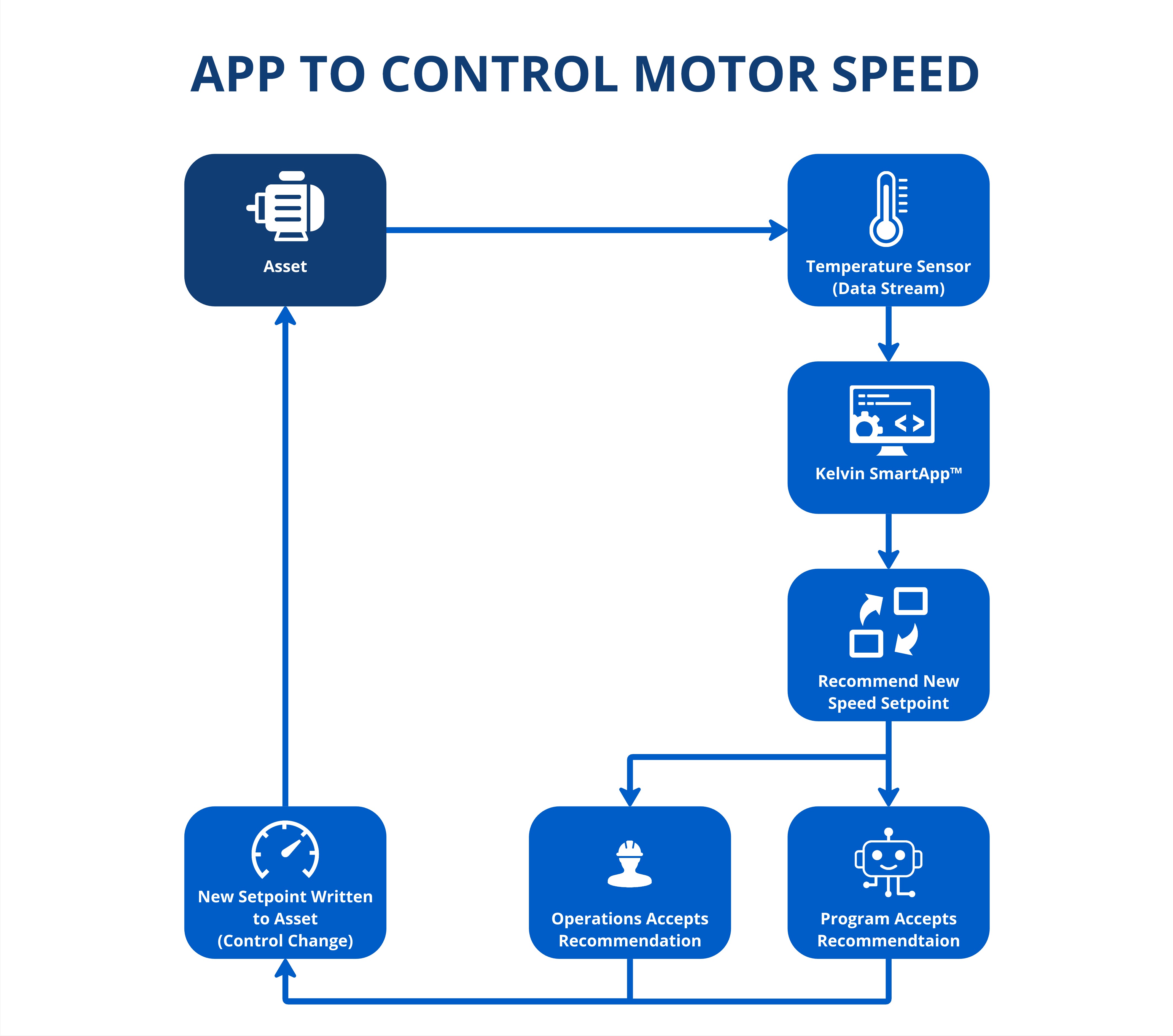 If the upper temperature threshold is breached, then the app will automatically generate a new Control Change packaged into a Recommendation that will have a new optimized motor speed setpoint to maintain a lower motor temperature.