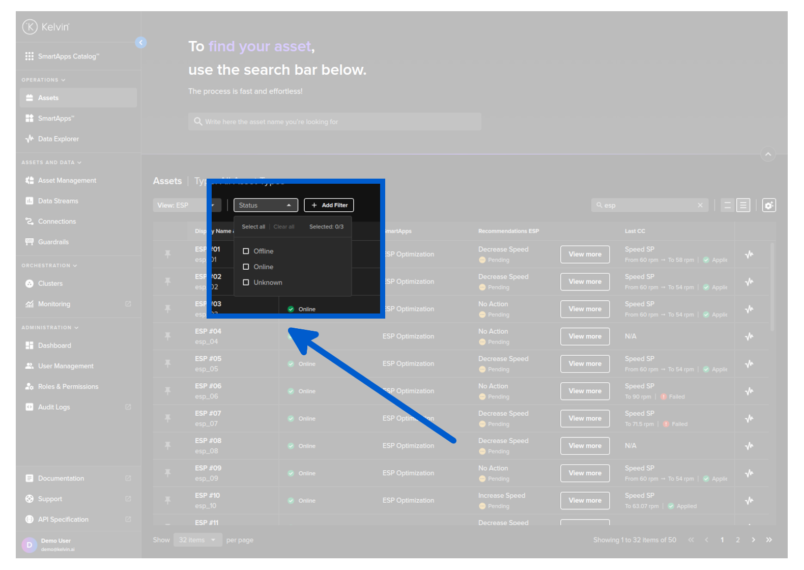 You can limit the Assets shown according to their current status. There are four statuses available; Offline, Online, Partially Online and Unknown.