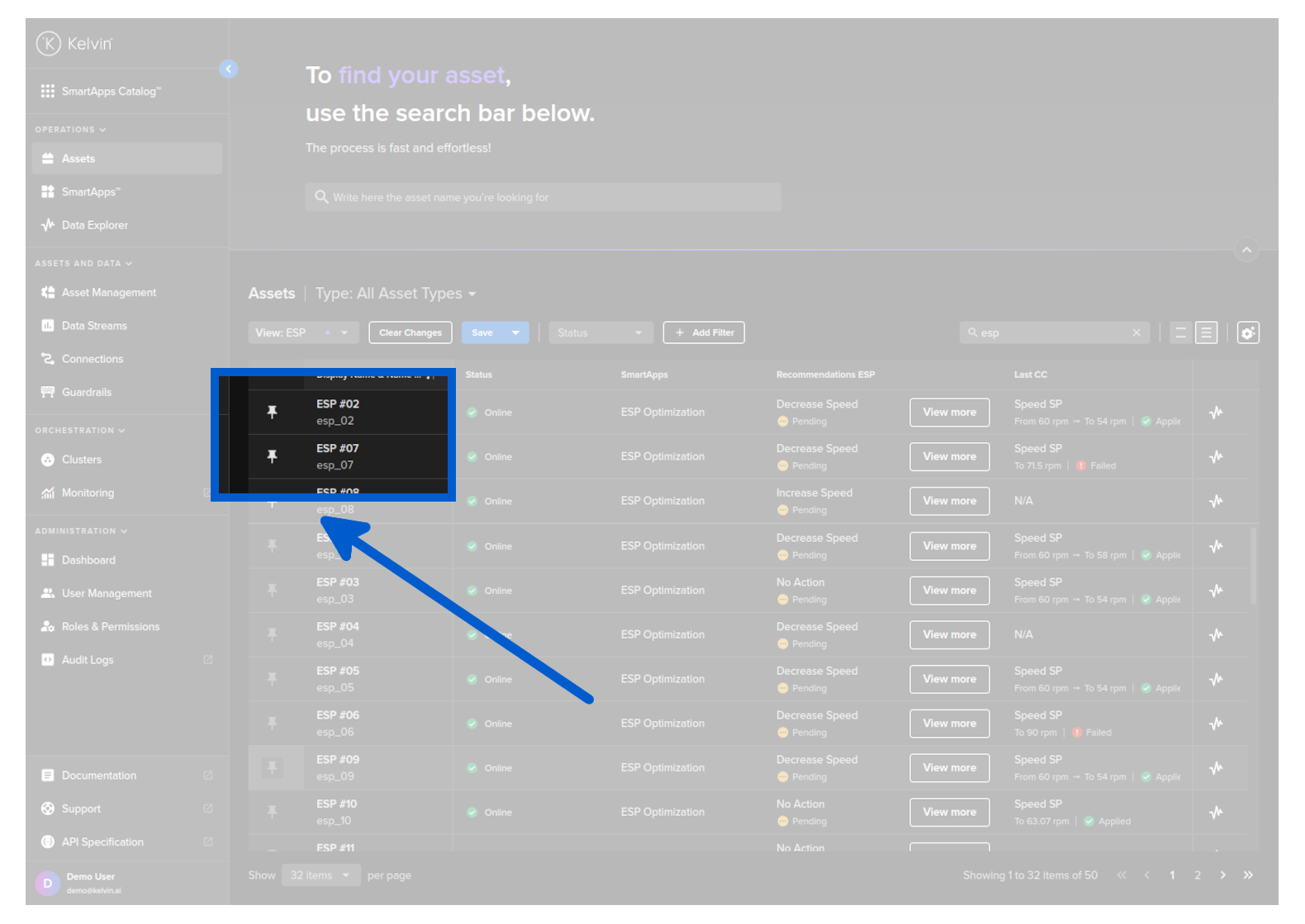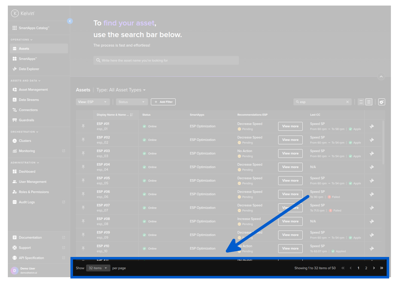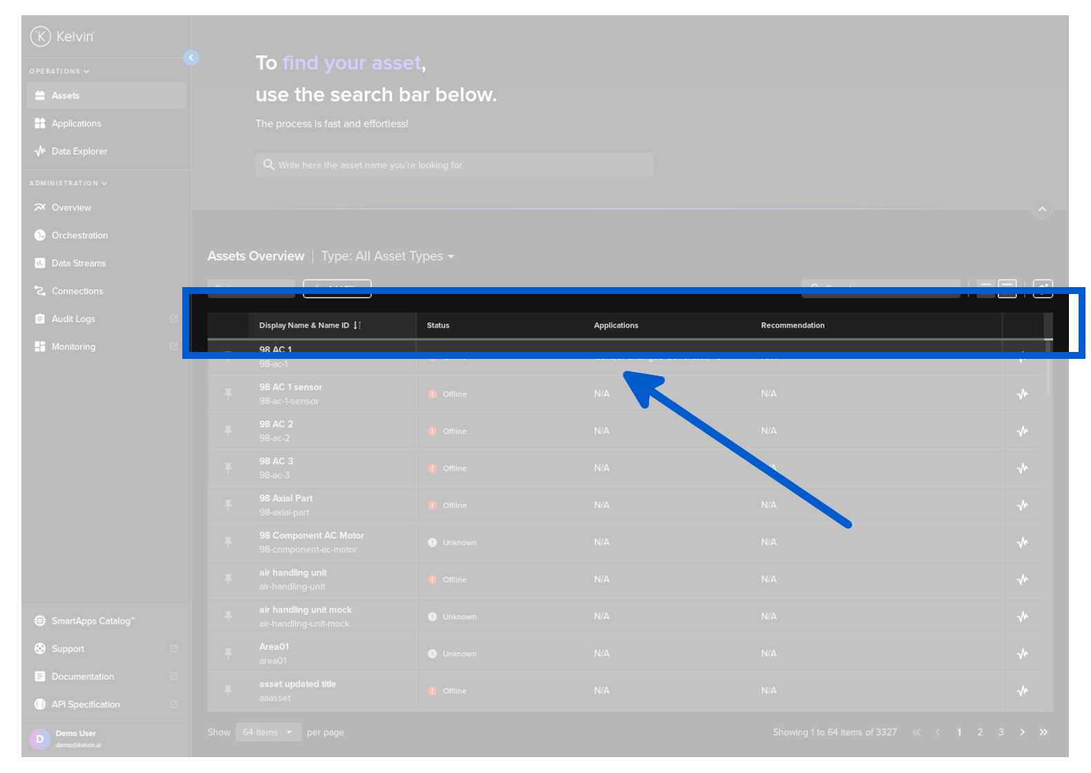 Here you have a list of all Assets registered in Kelvin. From here you can see the Assets and associated information.