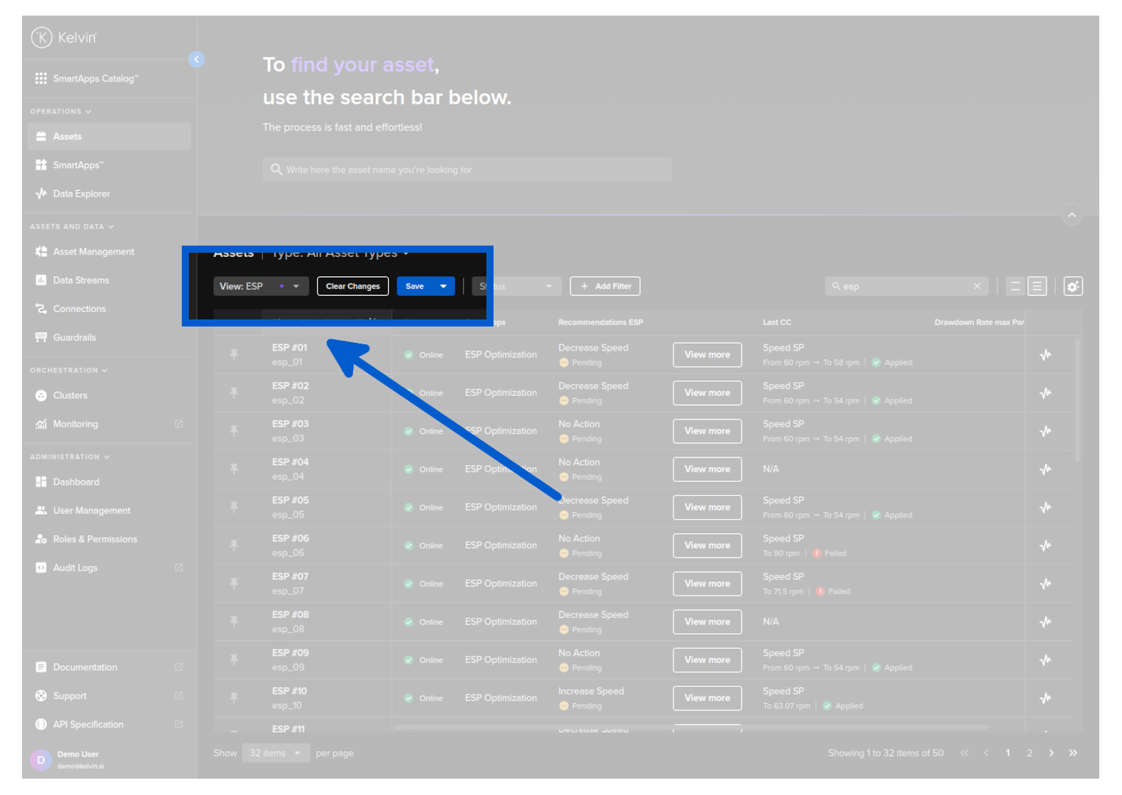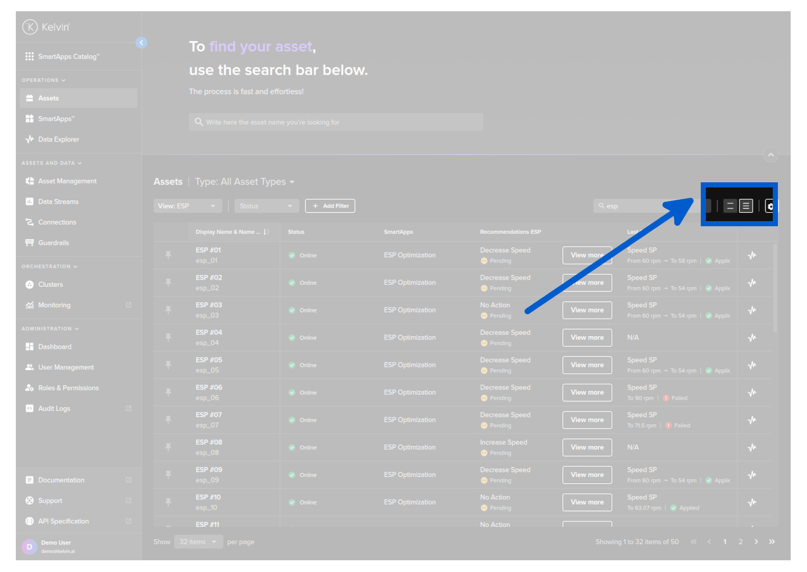 On this page you get an overview of all Assets being managed by Kelvin. You can build custom views for the overview by using information like Data Streams, Kelvin SmartApps™ configurations, Recommendations, actions like last Control Change and more.
