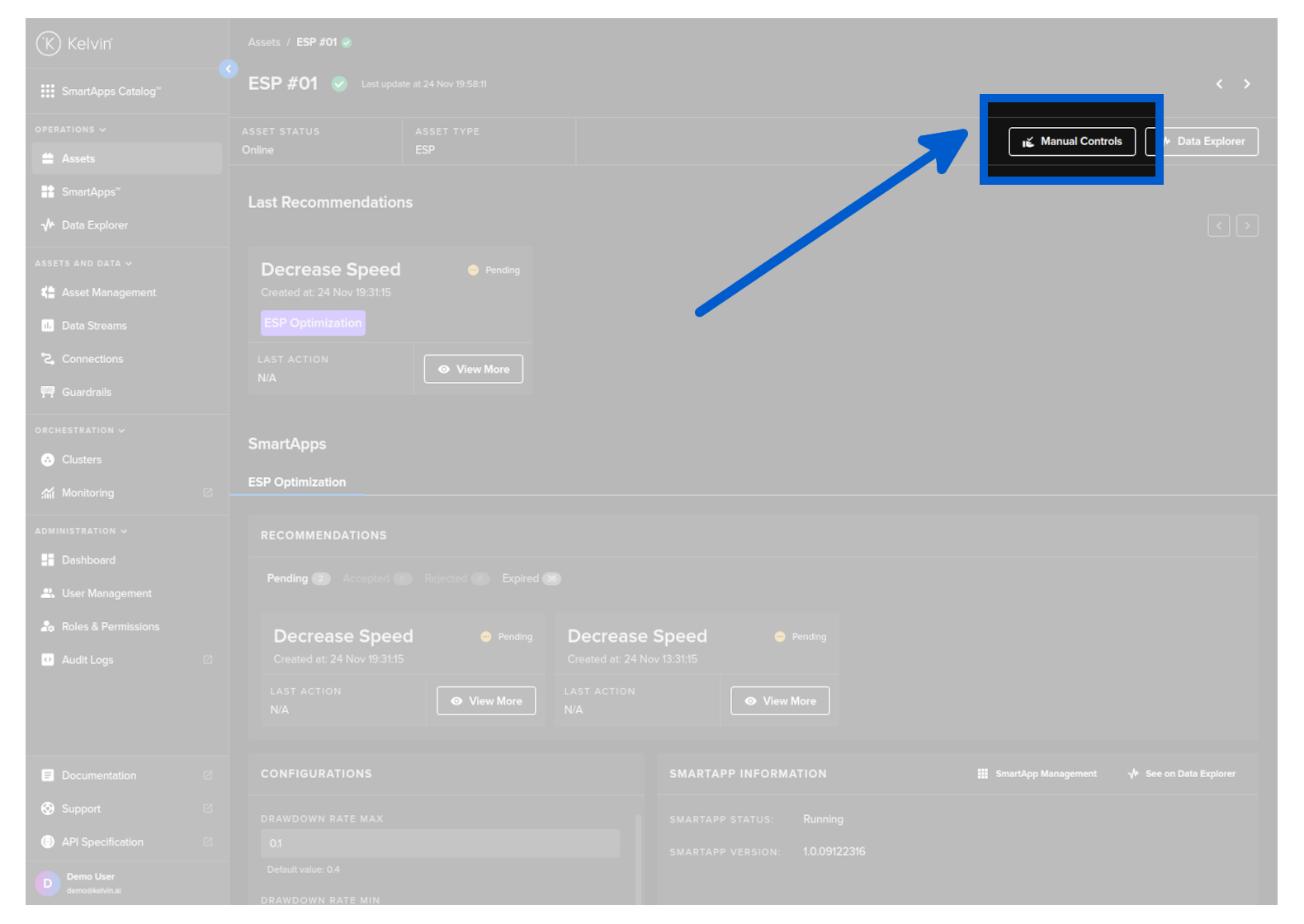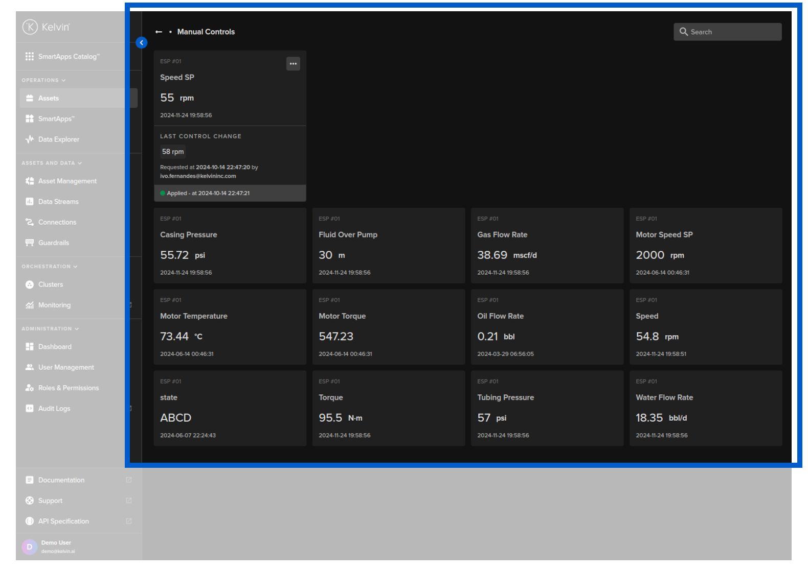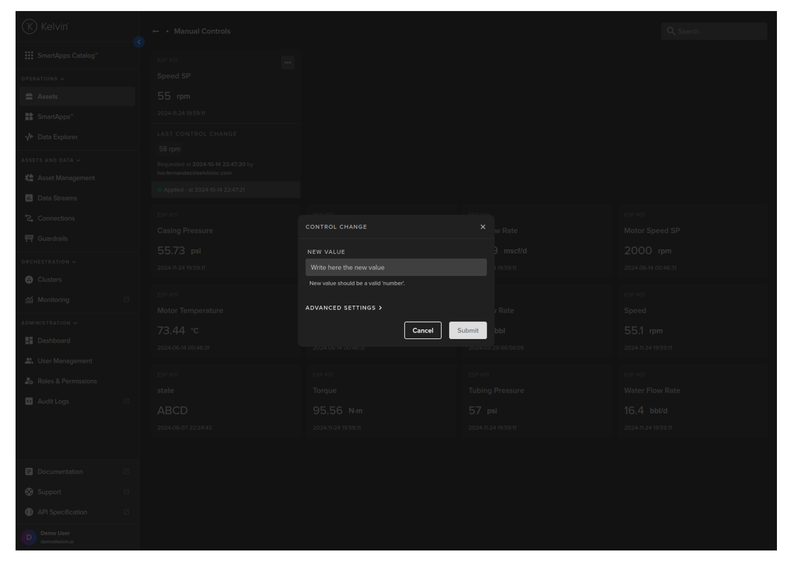 On this page you will learn about monitoring live values and changing values of Data Streams related to the selected Asset in Manual Controls in Kelvin UI.