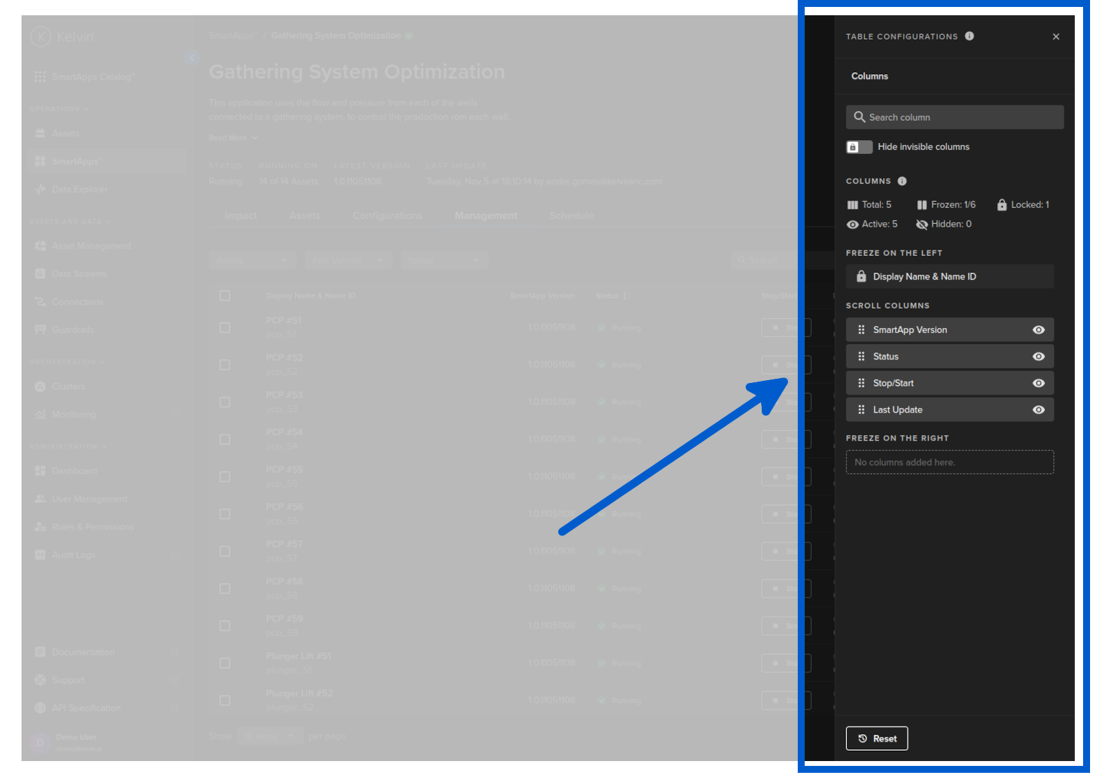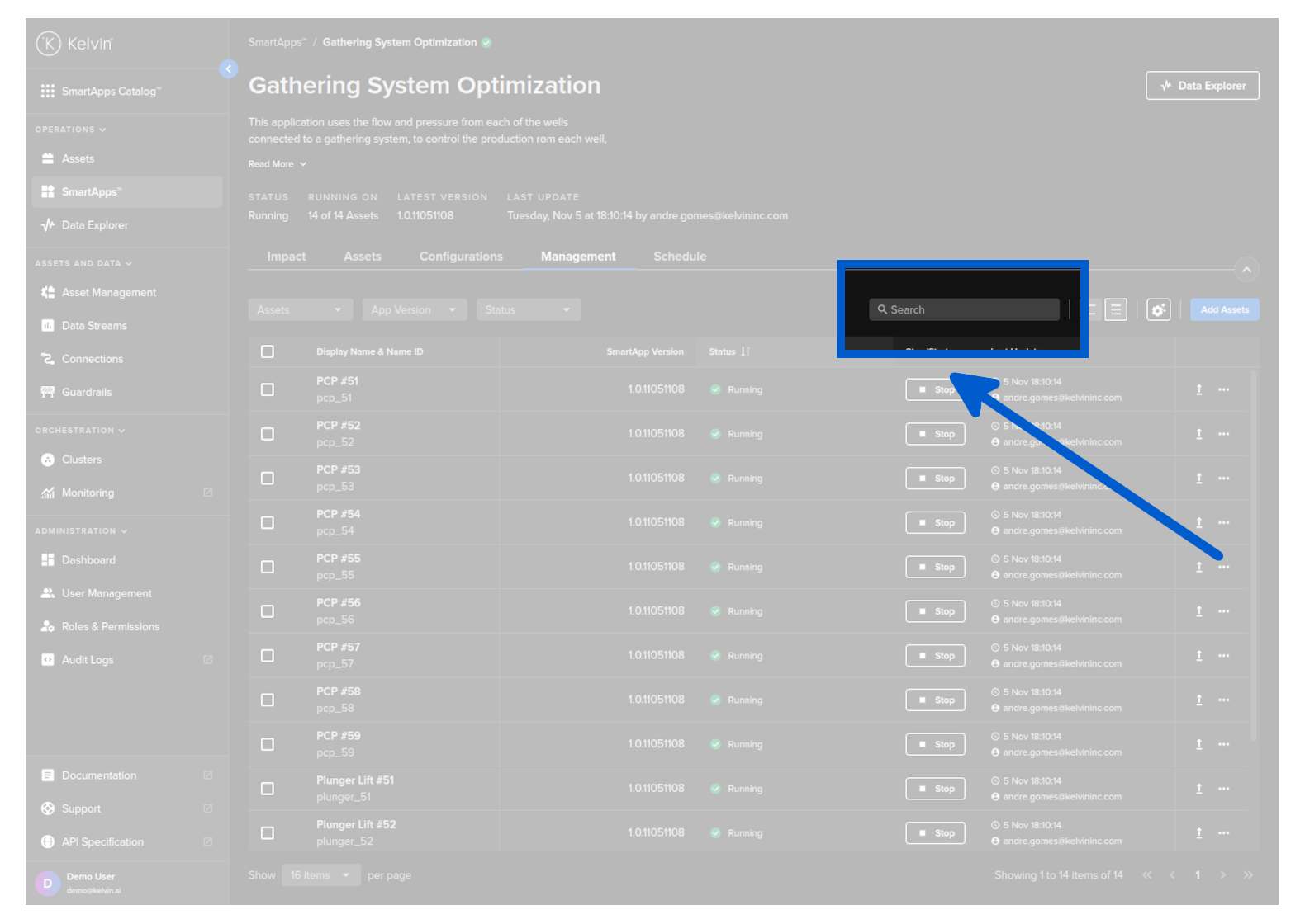 Click on the Management tab, and you can see a list of Assets and the configuration options for teh Kelvin SmartApp™.