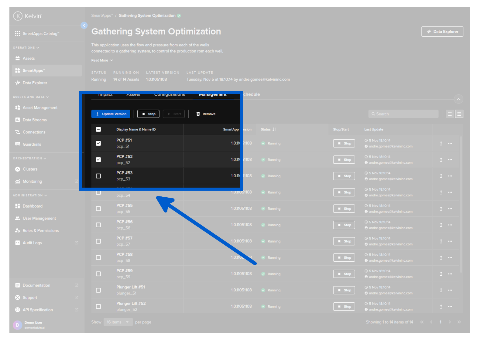 You can upgrade one or more Assets to a new Kelvin SmartApps™ version.