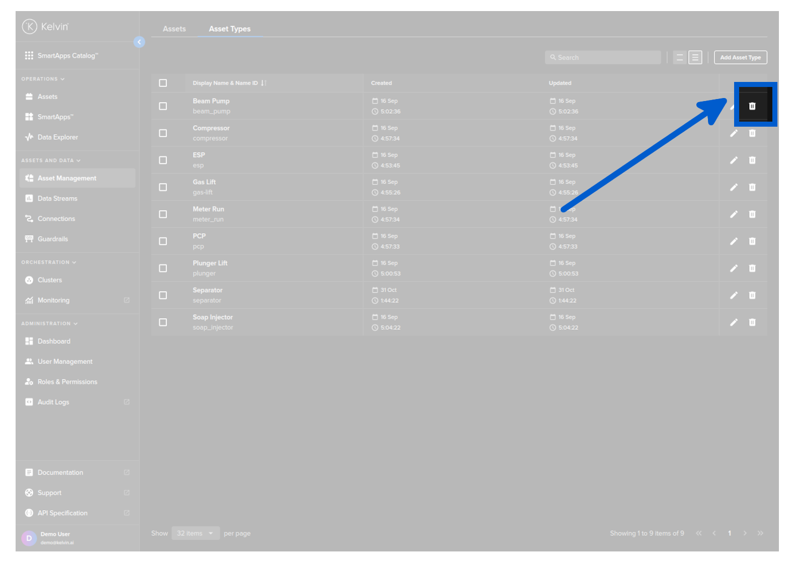 To delete an Asset Type, click on the rubbish bin icon on the right hand side of of an Asset Type row;