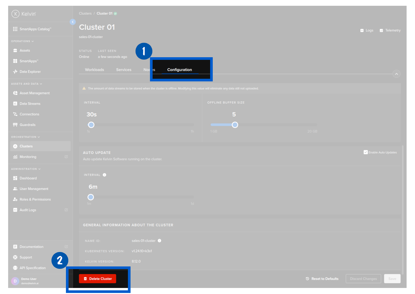 This will permanently delete all Kelvin software from the cluster including all Kelvin SmartApps™, Docker Apps and Connectors deployed to the cluster.