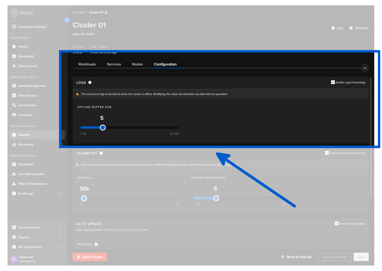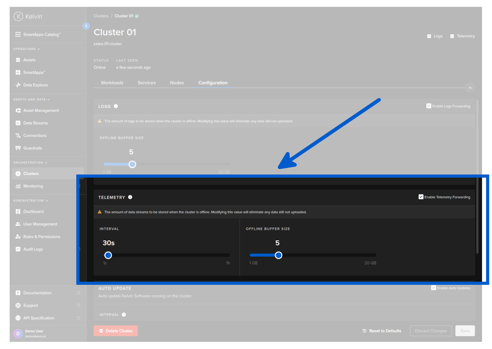 From Orchestration menu click on a single Cluster, then under the Configuration tab you can adjust the settings for the telemetry buffer size and recording interval while the cluster is not connected to the Kelvin.
