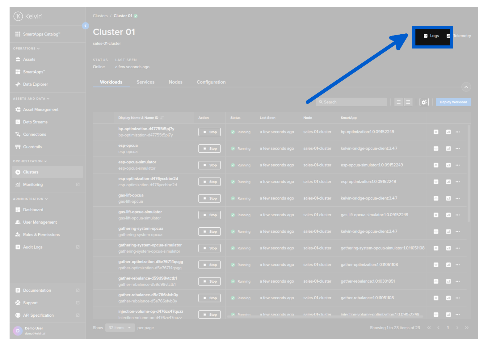 In the Kelvin UI you can view the logs of a Cluster and all the Workloads running on the Cluster.