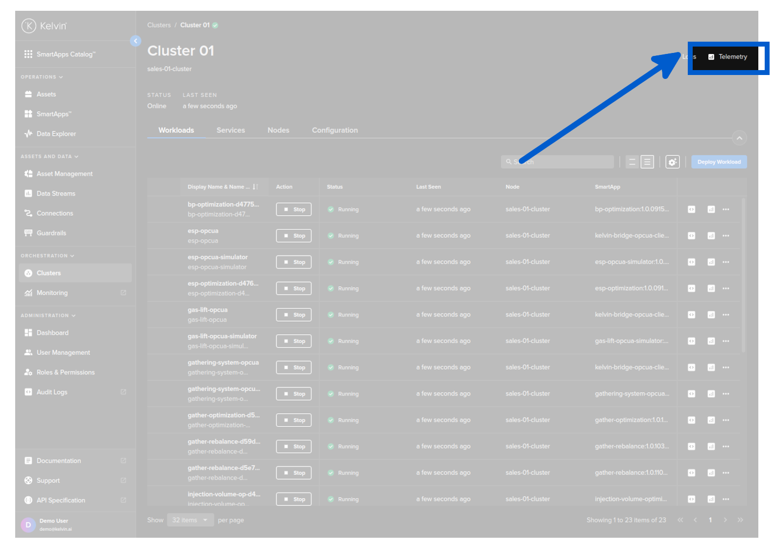 From Orchestration menu click on a single Cluster, then click on the Telemetry button in the top right hand corner.