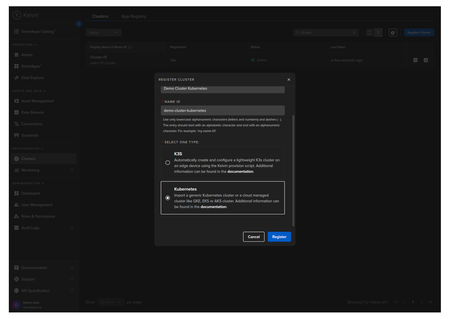To start, go to the Orchestration page and click on the Register Cluster button;