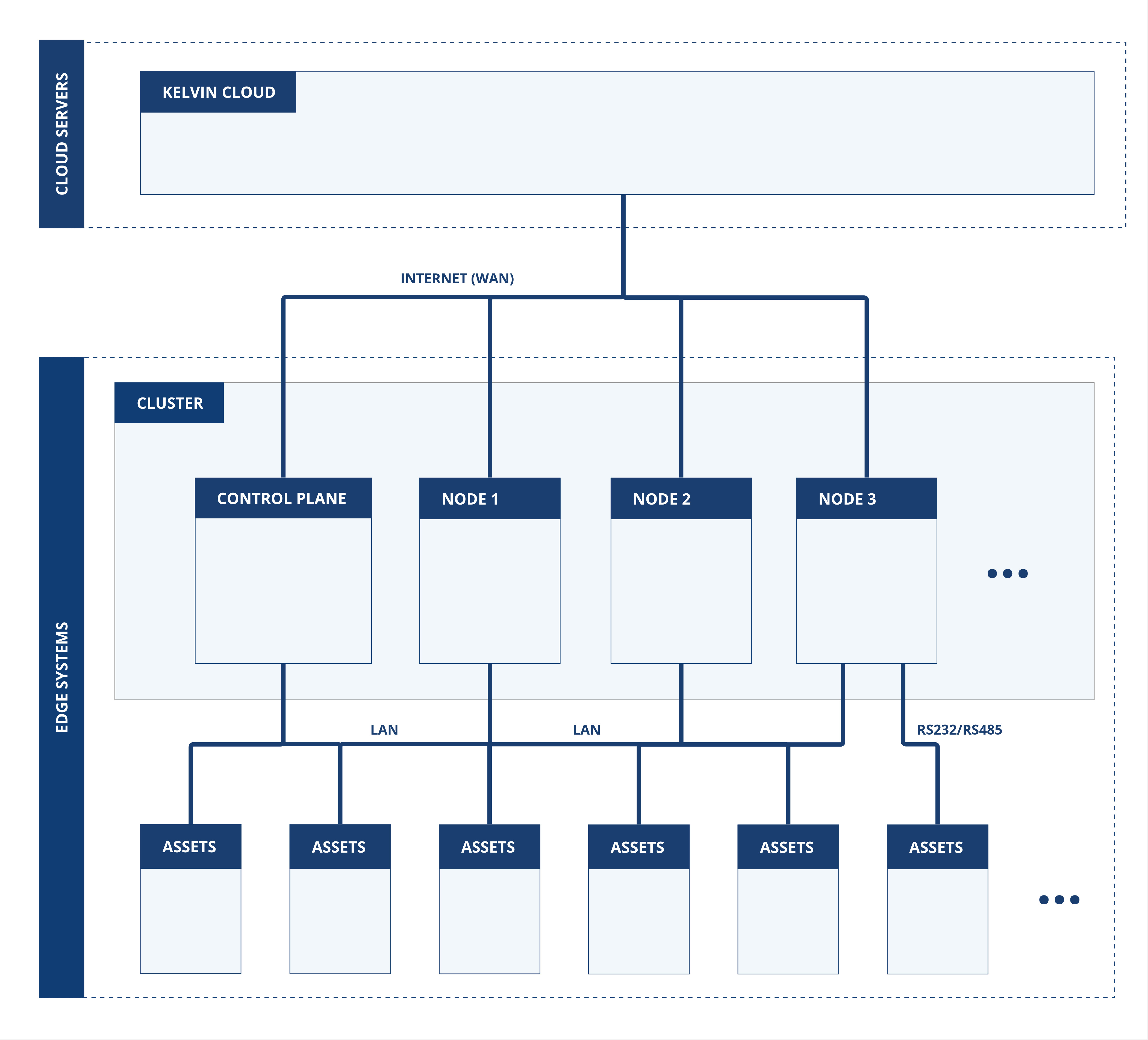 Under the hood, a Cluster in Kelvin is a Kubernetes cluster with a number of Kelvin pods deployed running specialized software to run all the Kelvin edge services on the Kubernetes Cluster and also provide fault tolerant communications to your Assets and to the Cloud.