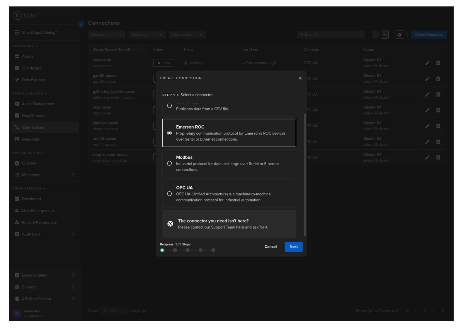 You can add an Emerson Operations Controller (ROC) connection through the Kelvin UI, Kelvin SDK and Kelvin API.