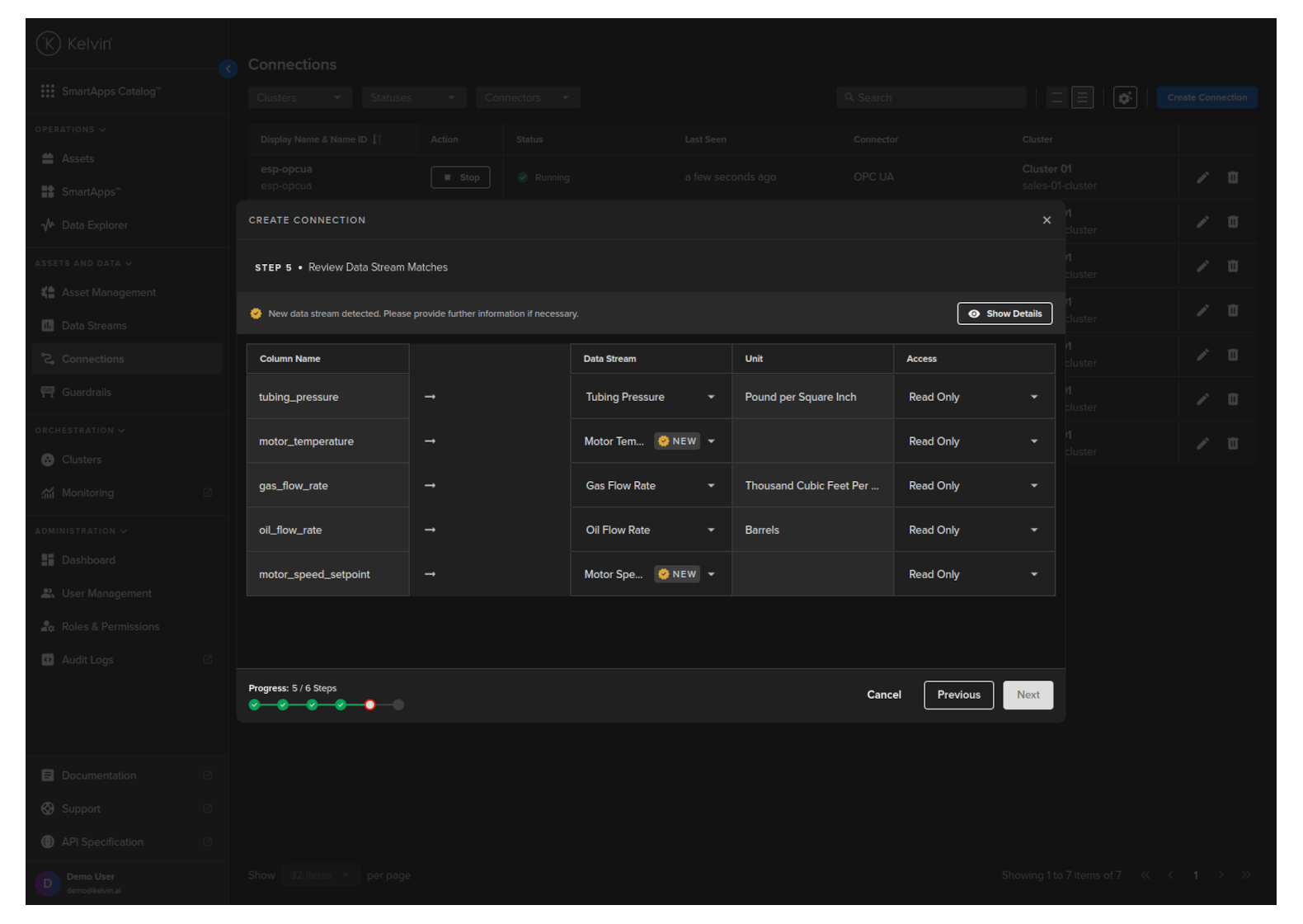 Kelvin UI will attempt to automatically select the right Data Stream based on the column name.