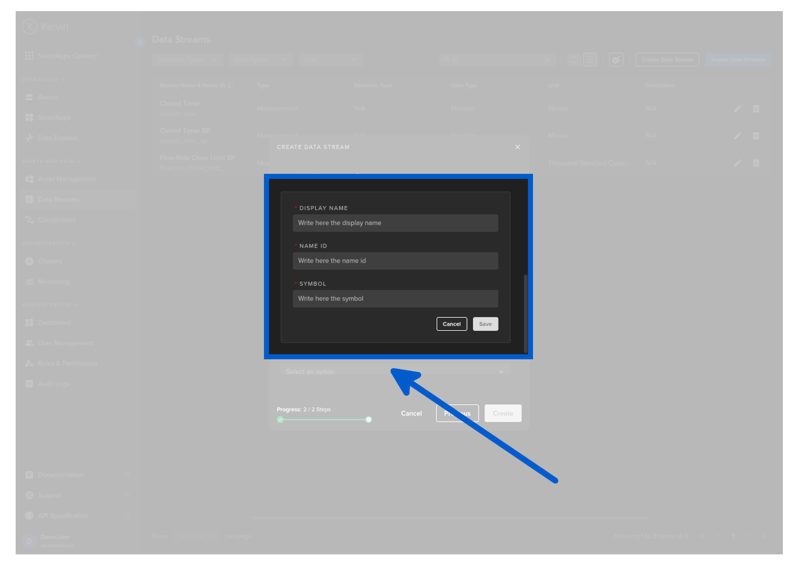 A popup will appear where you can create the new unit. Once created, you can then select it and click Create to create the new Data Stream.