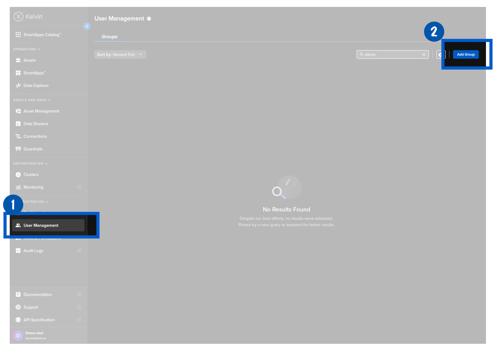 To start, click on User Management in the Administration section of the left side bar and click on the Add Group button.