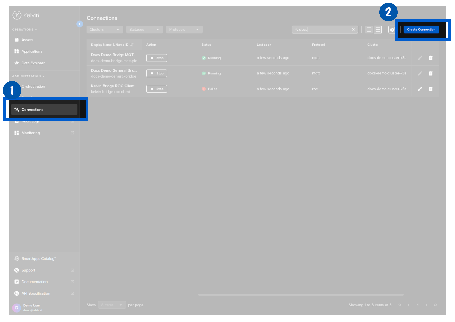 Then in Kelvin UI under Connections you will see your Connection deployed and running.