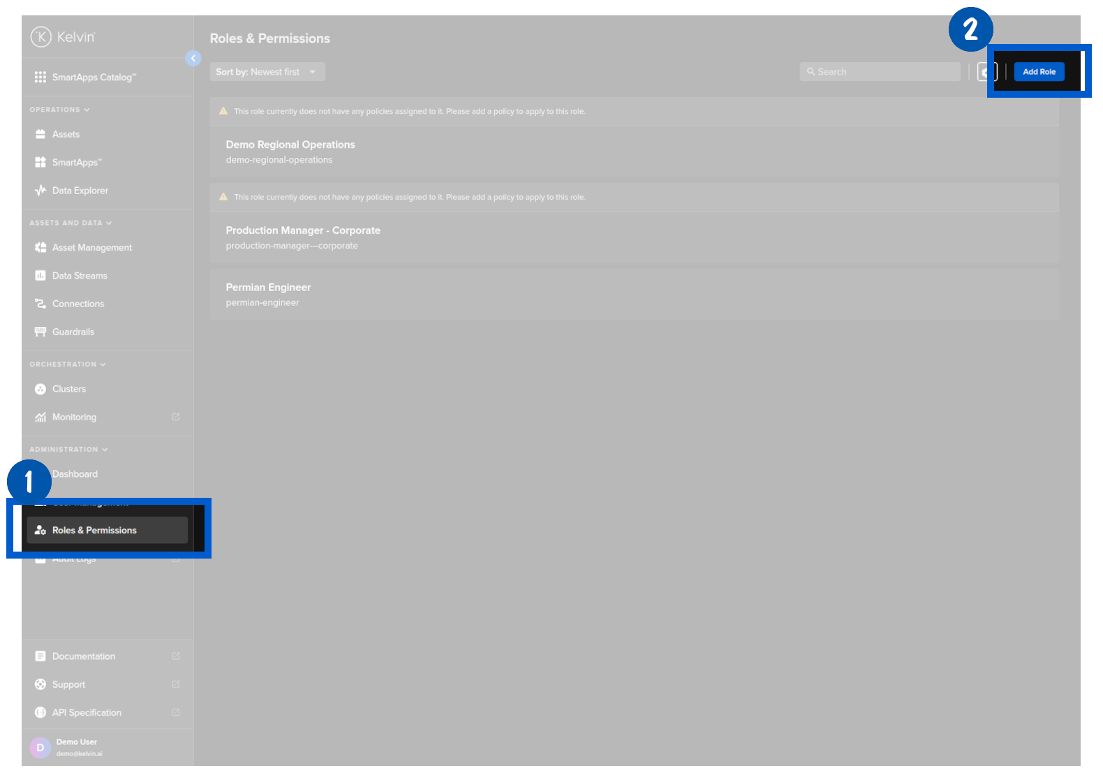 Once the user has access to the Kelvin Platform, the Administrators can assign what rights the user has through Permissions and Policies.