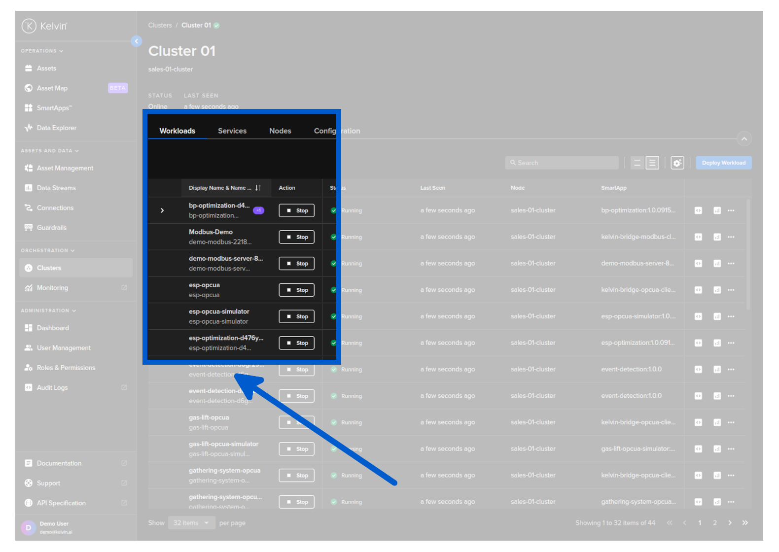 Go to a Cluster in Kelvin UI and find the workload that you want to control.