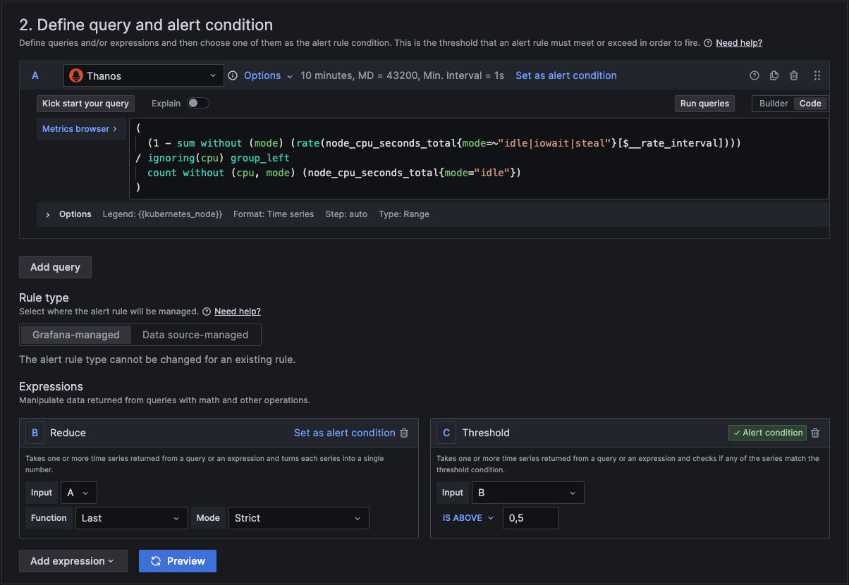 This will initiate an alert if any nodes CPU usage exceeds a threshold.