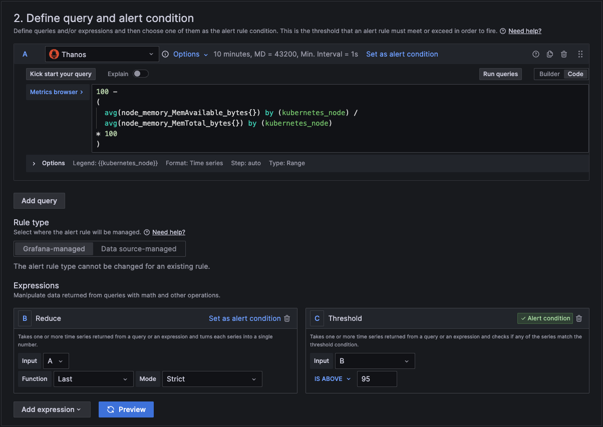 This will initiate an alert if any nodes Memory usage exceeds a threshold.