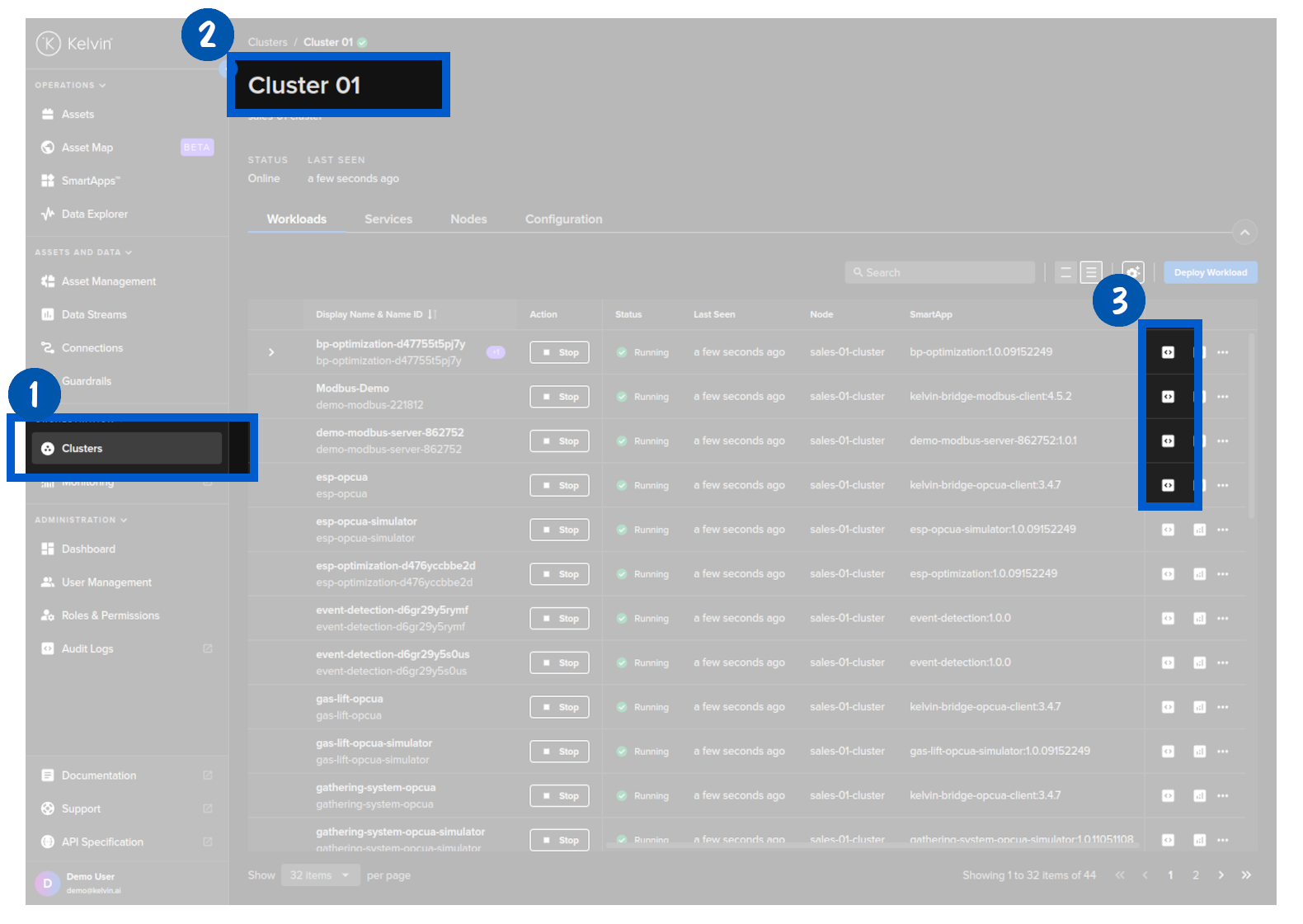 You can view the logs by clicking on the logs button on the Workload row in Orchestration. Each Workload has its own logs.