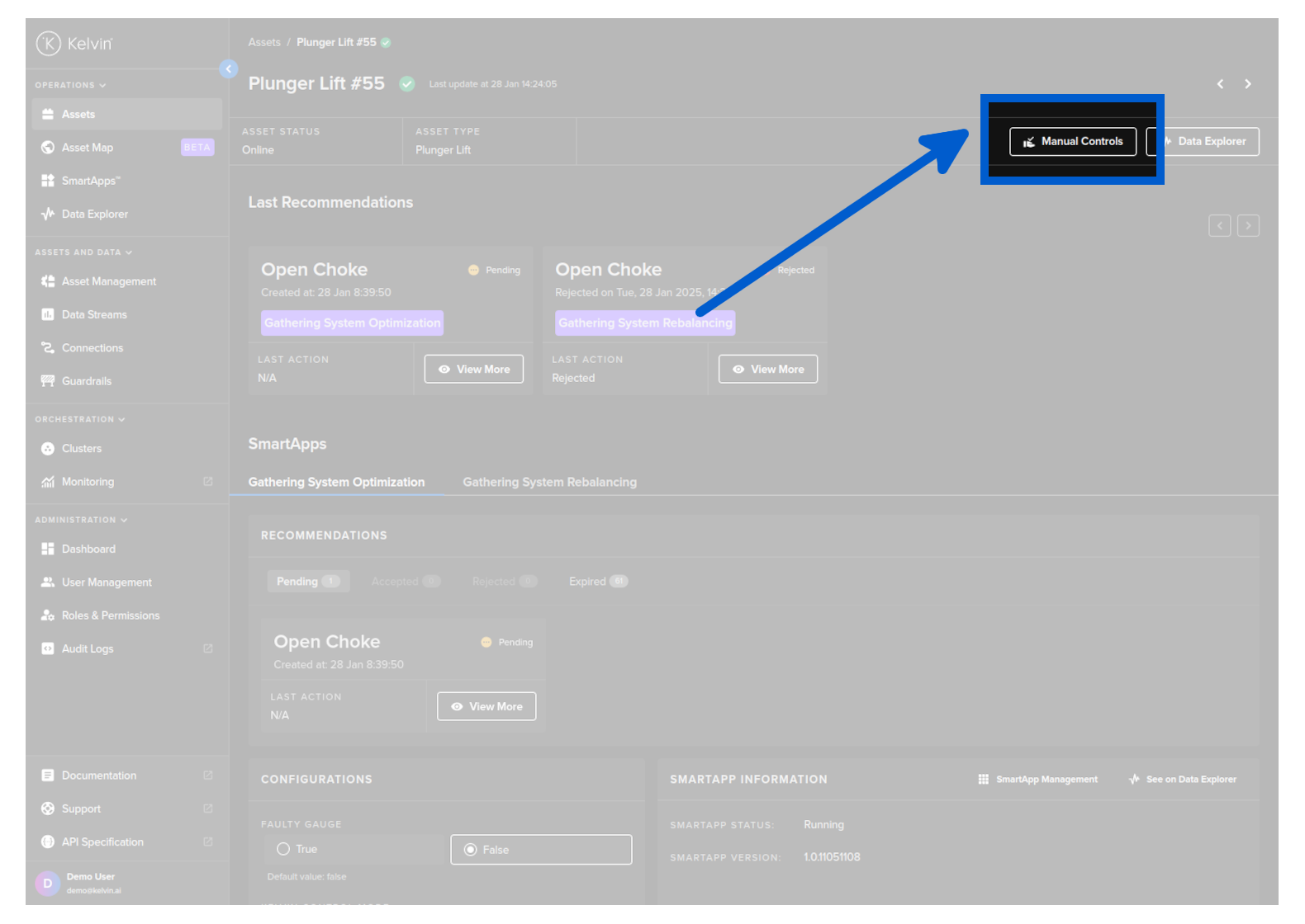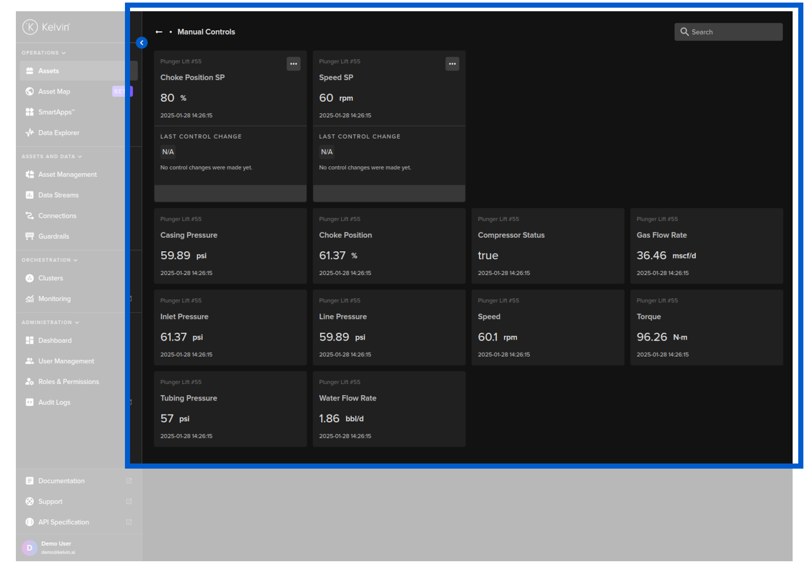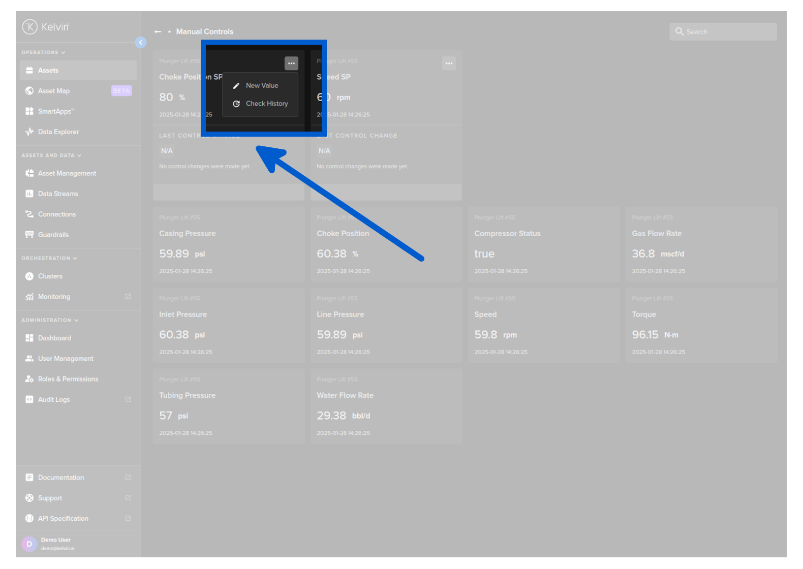 On this page you will learn about monitoring live values and changing values of Data Streams related to the selected Asset in Manual Controls in Kelvin UI.