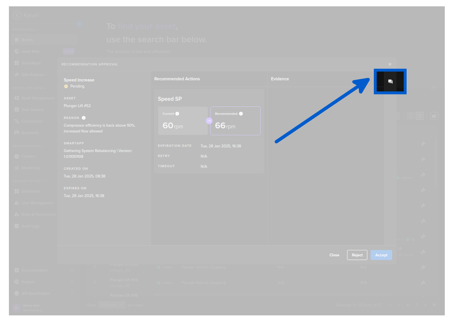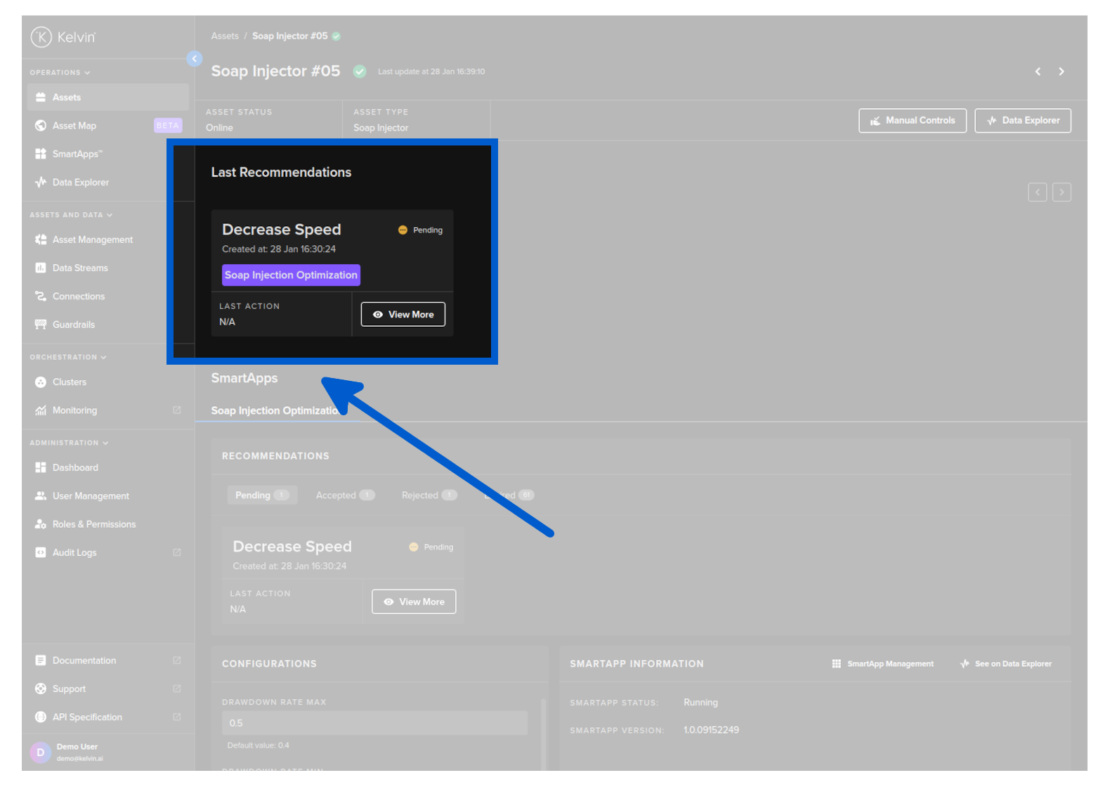 When you select an Asset, in the Asset Details page you can see the Last Recommendation from any Kelvin SmartApp™ that is processing the selected Asset. You can read more about this feature here.