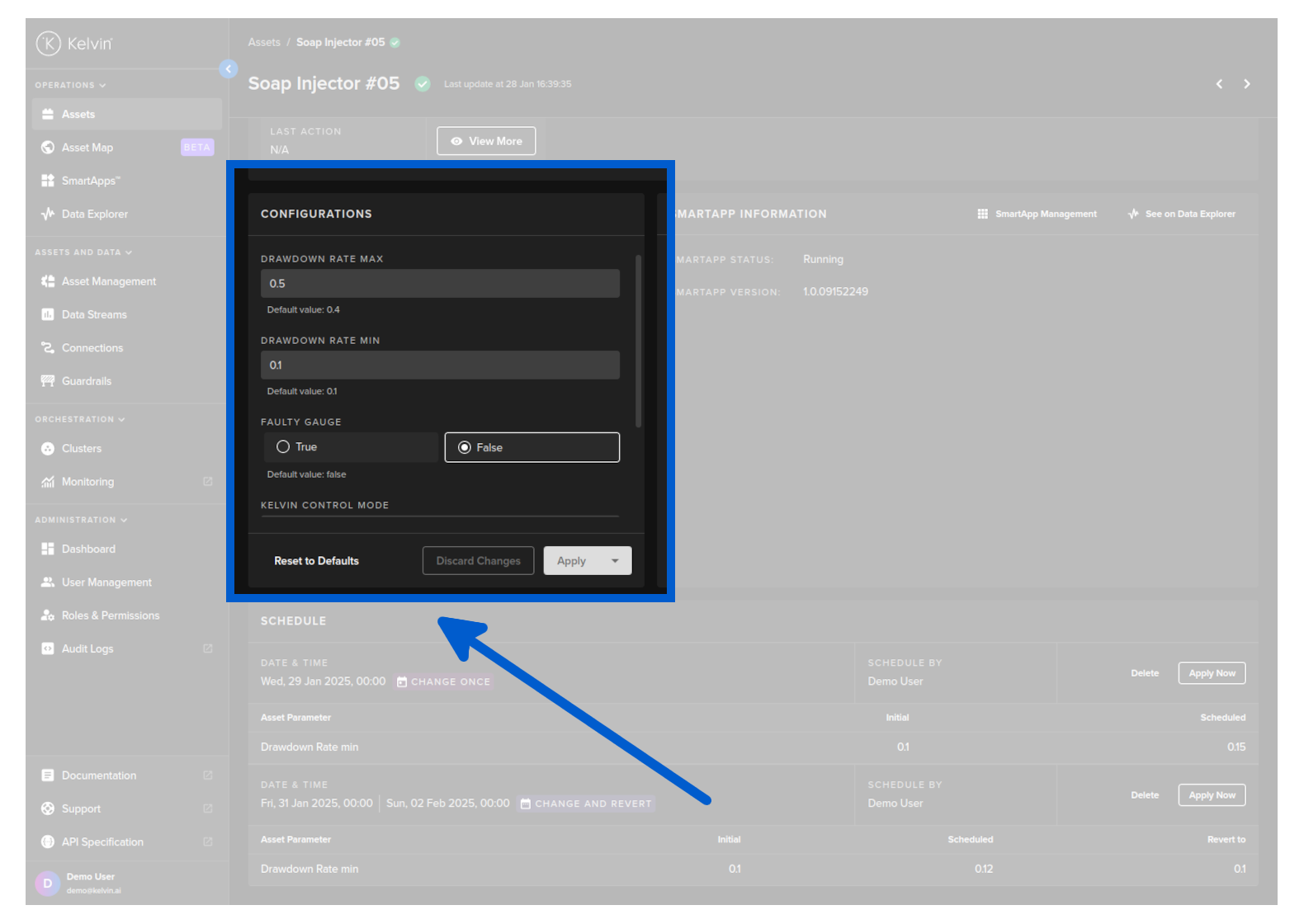 There are two locations where you can list schedule parameter changes for an Asset or Kelvin SmartApps™;