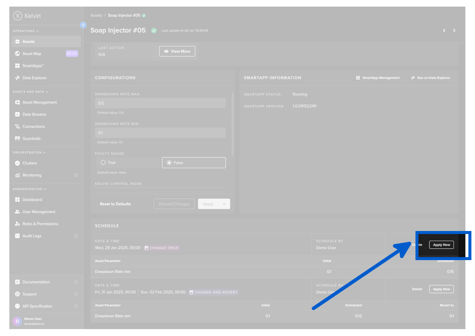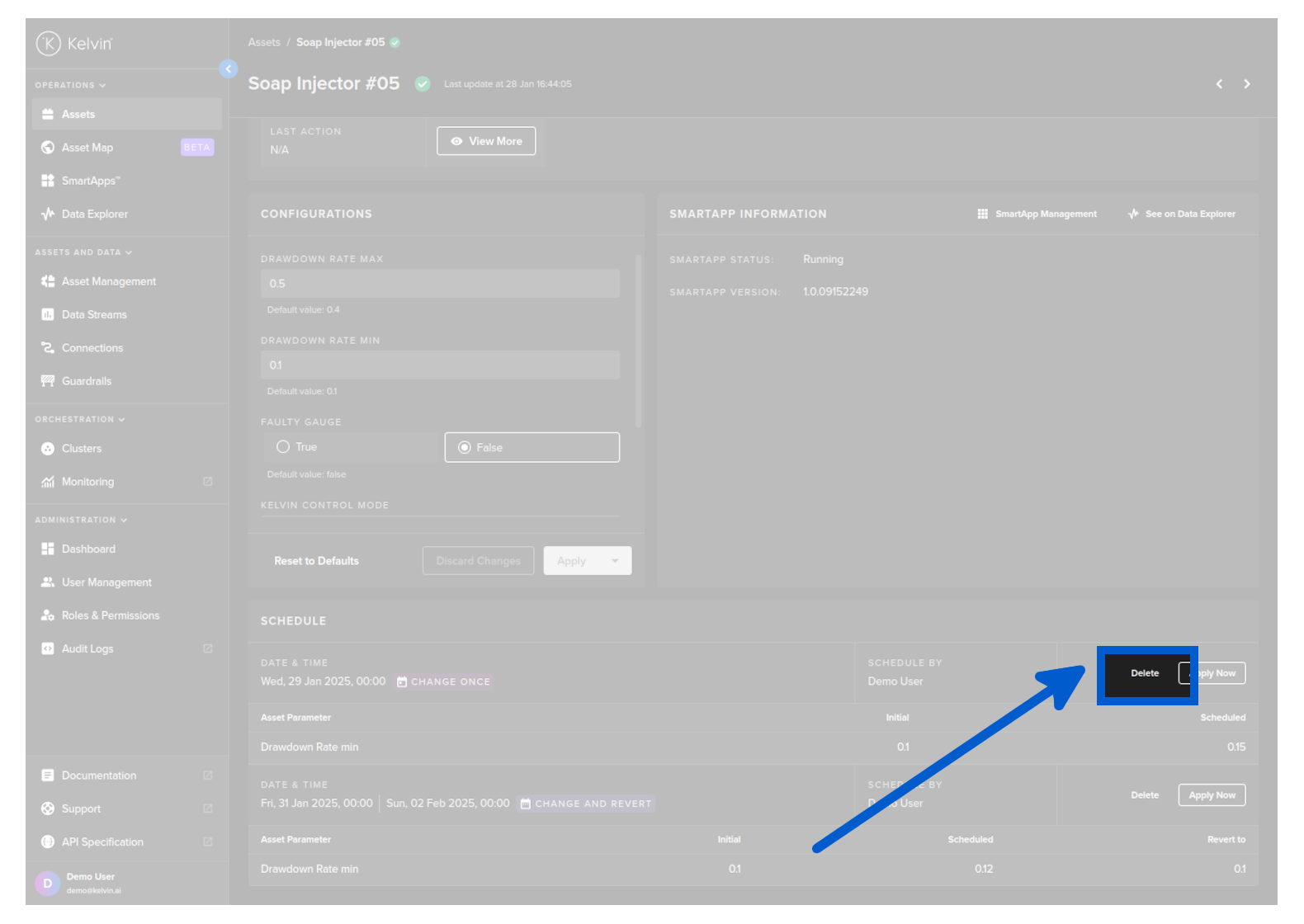- In the Asset page: Here you can schedule an individual Asset's parameters in a Kelvin SmartApp™.