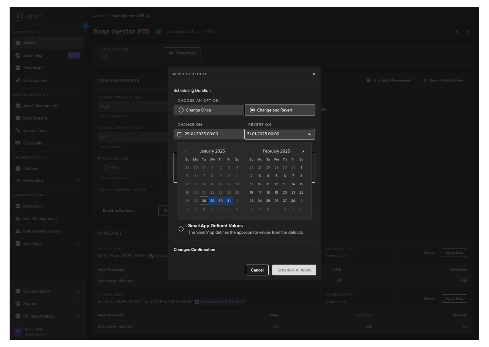If the schedule parameter change has multiple assets to change/revert, then you can only apply/revert from Kelvin SmartApps™ page.