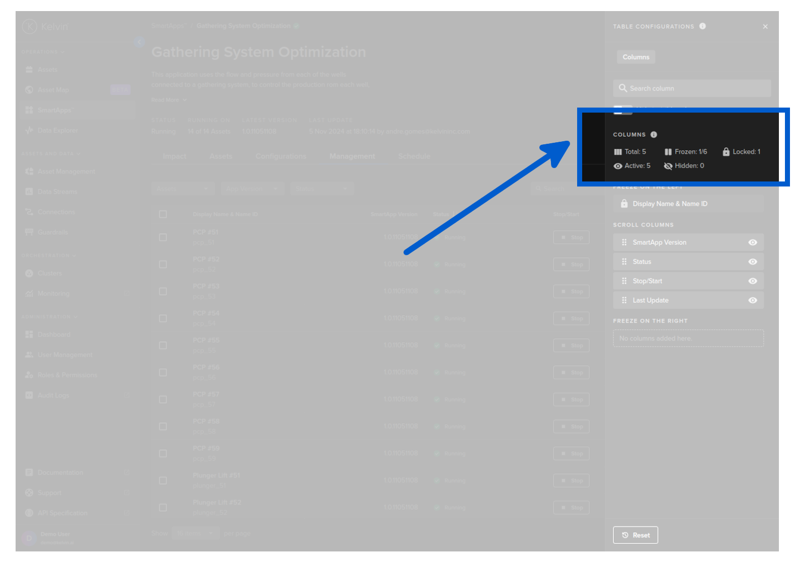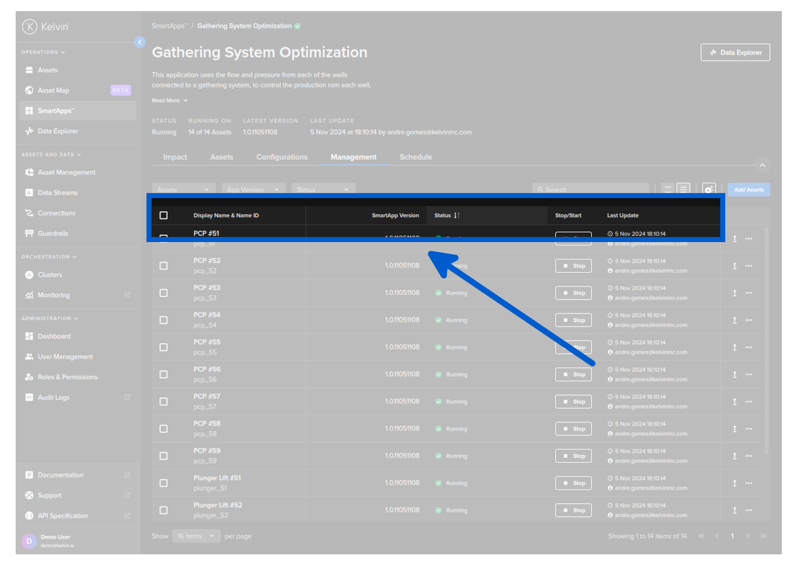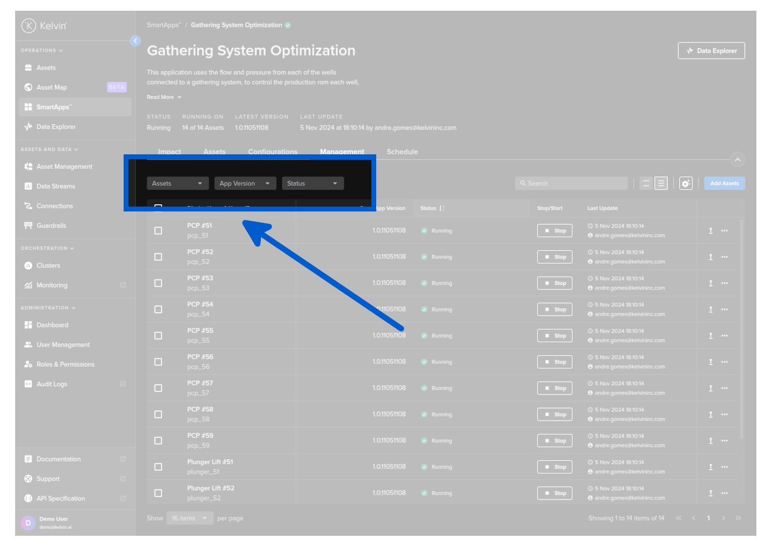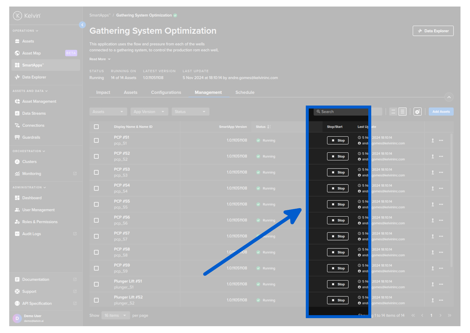 Click on the Management tab, and you can see a list of Assets and the configuration options for teh Kelvin SmartApp™.
