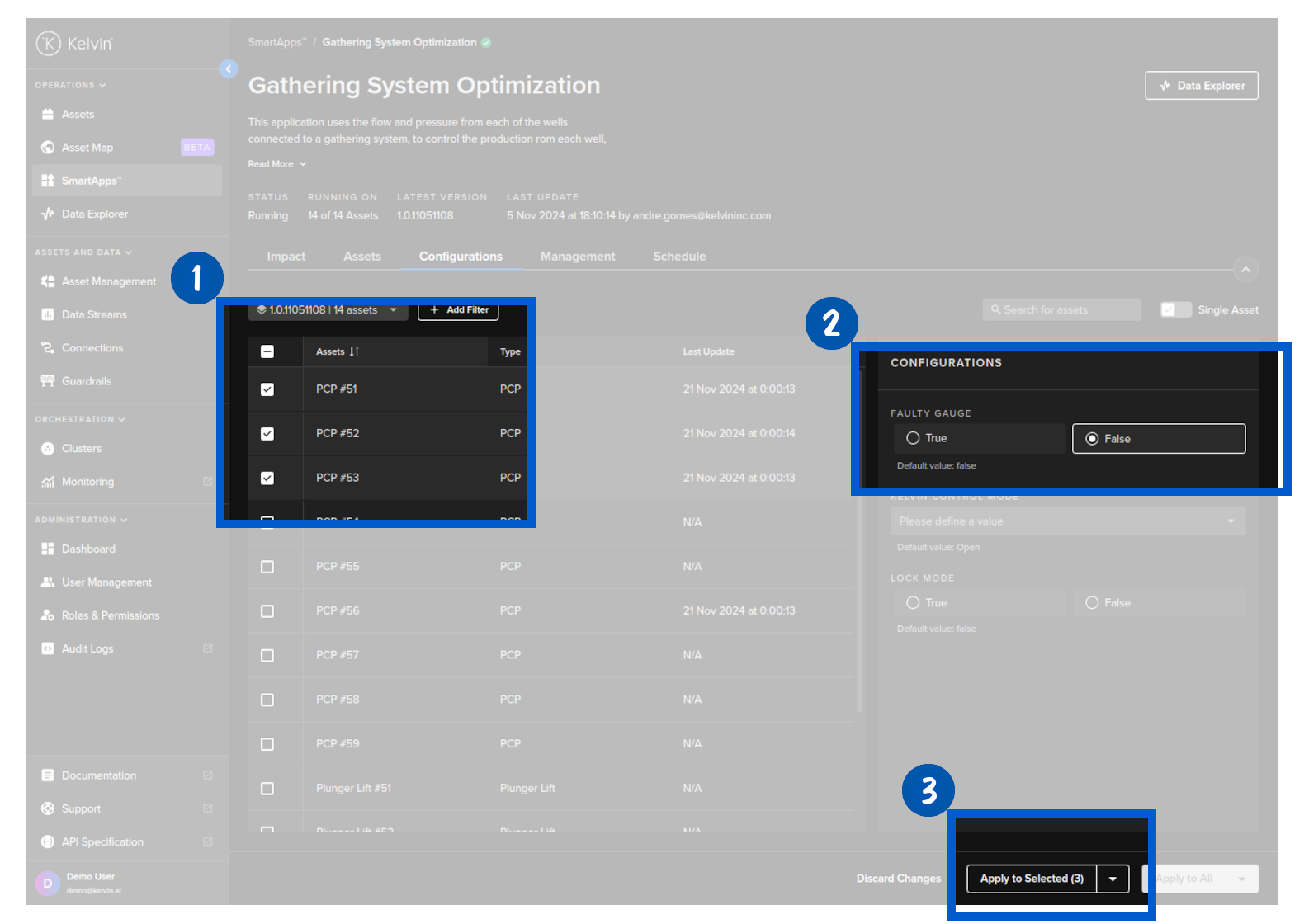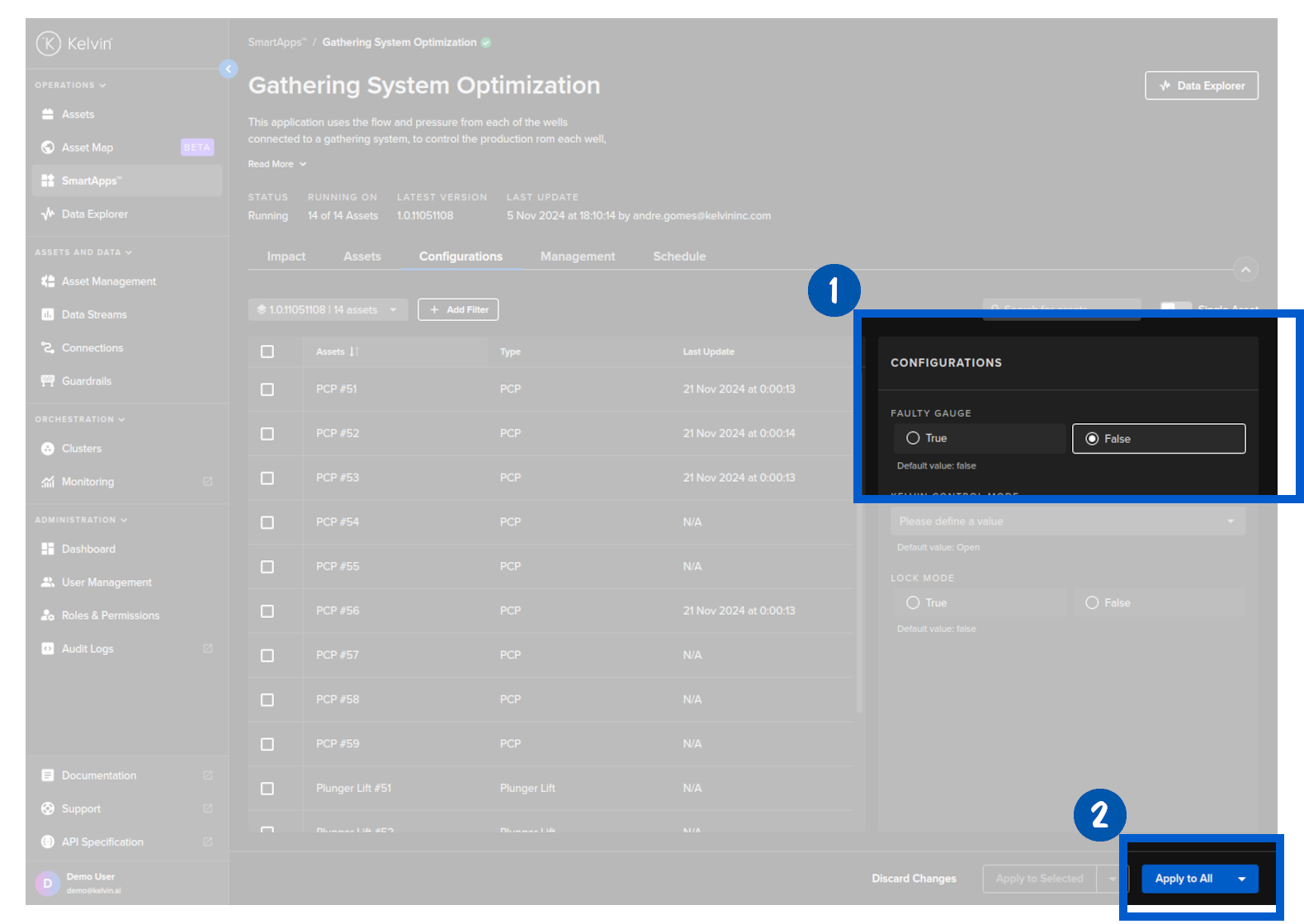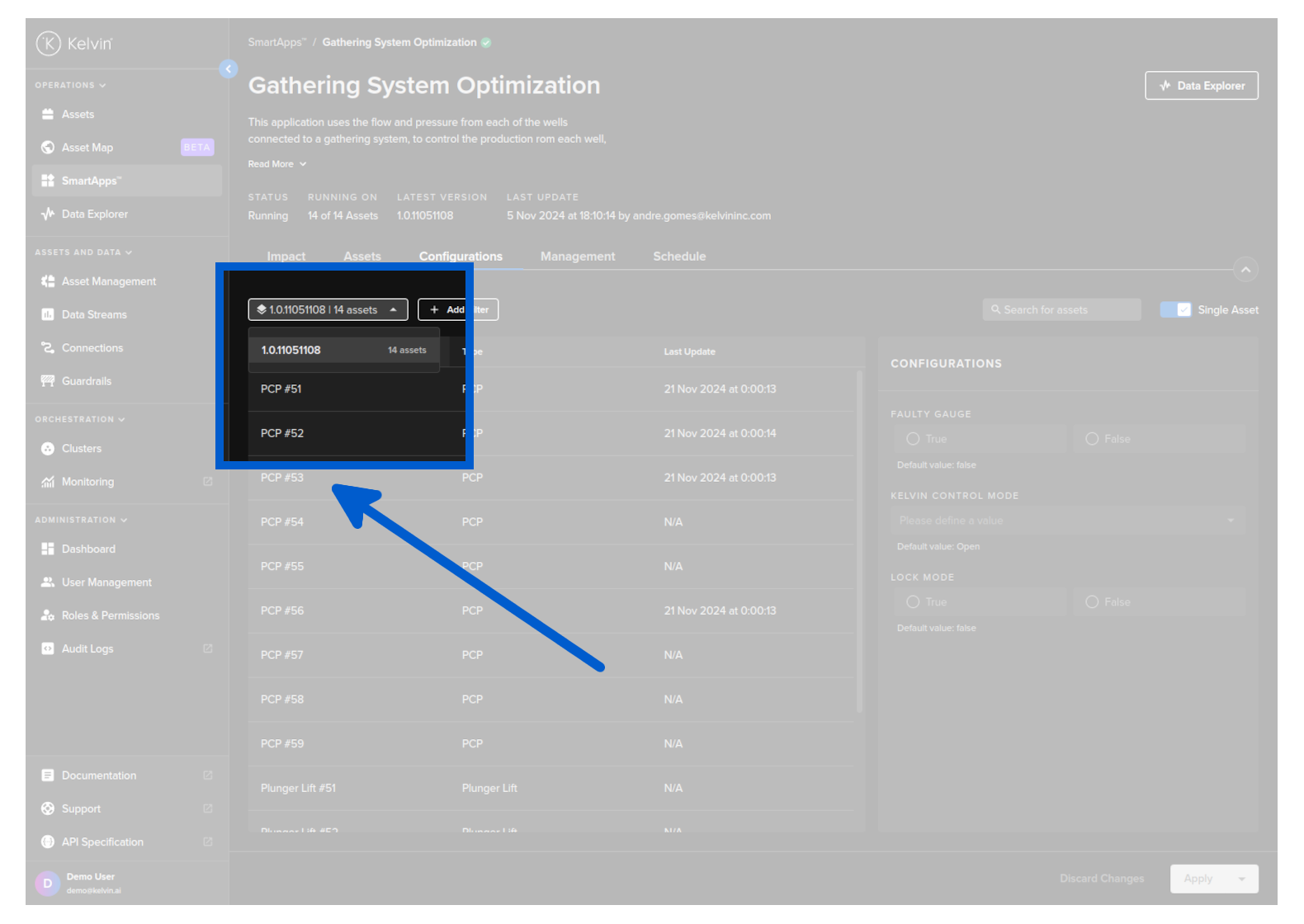 Click on the Configurations tab, and you can see a list of Assets and the configuration options for Kelvin SmartApps™.