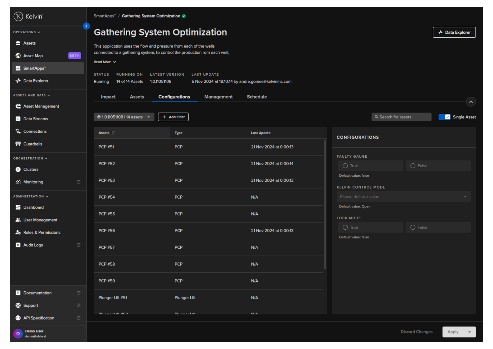On the right hand side you will see the standard configuration parameters available for Kelvin SmartApps™. When you click on an Asset, then the current configuration values in Kelvin SmartApps™ will be shown in the configurations section.