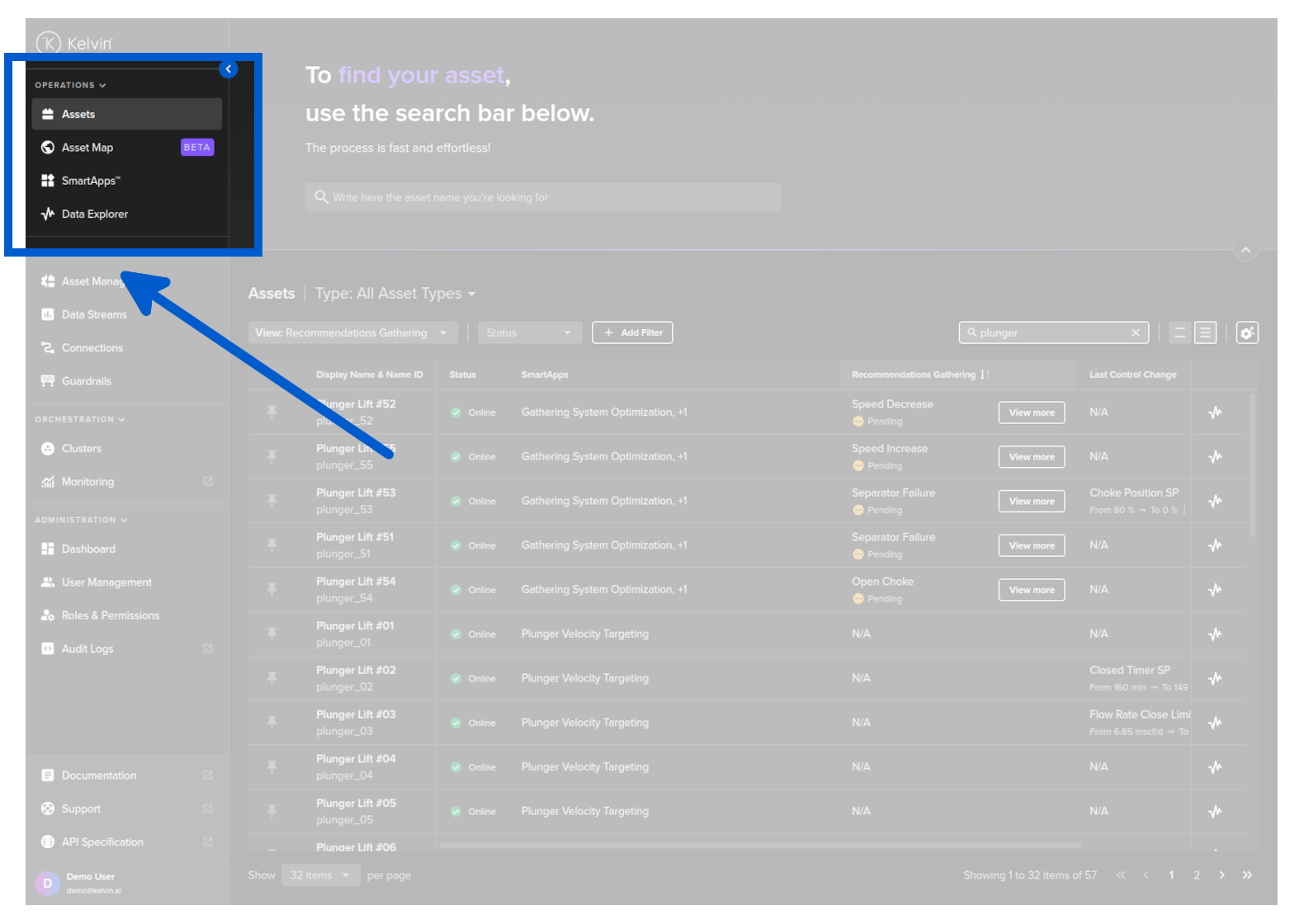 Operations Engineers will predominantly use Kelvin UI to handle all their assets. On the left hand side menu, the Operations section is focused on bringing all the tools required by Operations Engineers to monitor, manage, configure and control all assets under their responsibility.