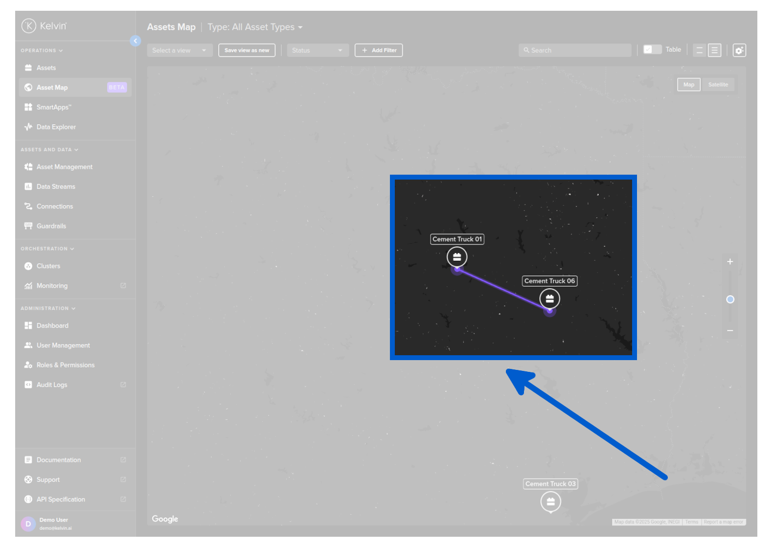 The Kelvin UI can visualize linked Assets by connecting them with a line on the global map in the Operations Overview page.