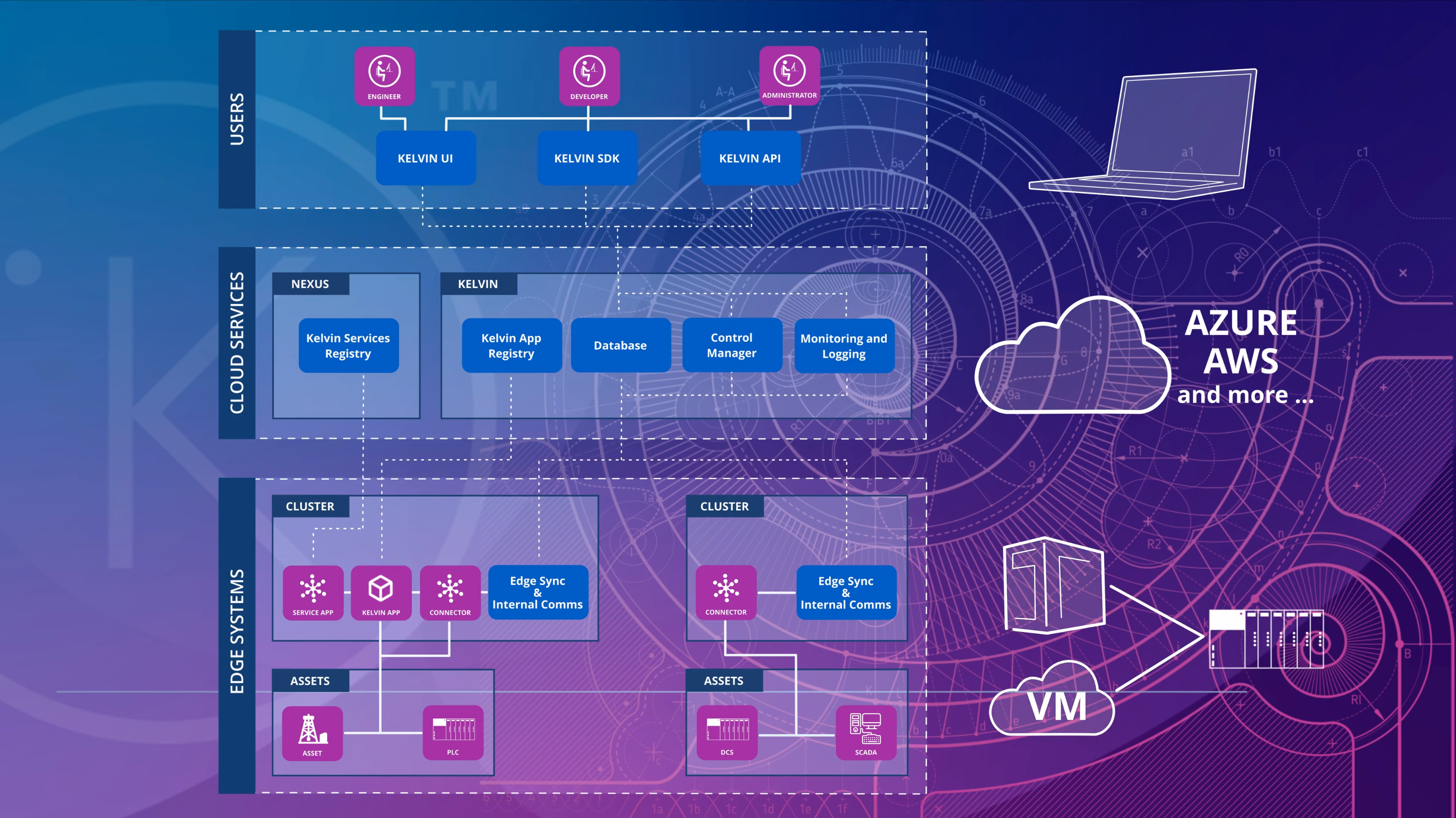 The core server components which make up the Kelvin Cloud Instance run in the cloud on Azure, AWS, etc.