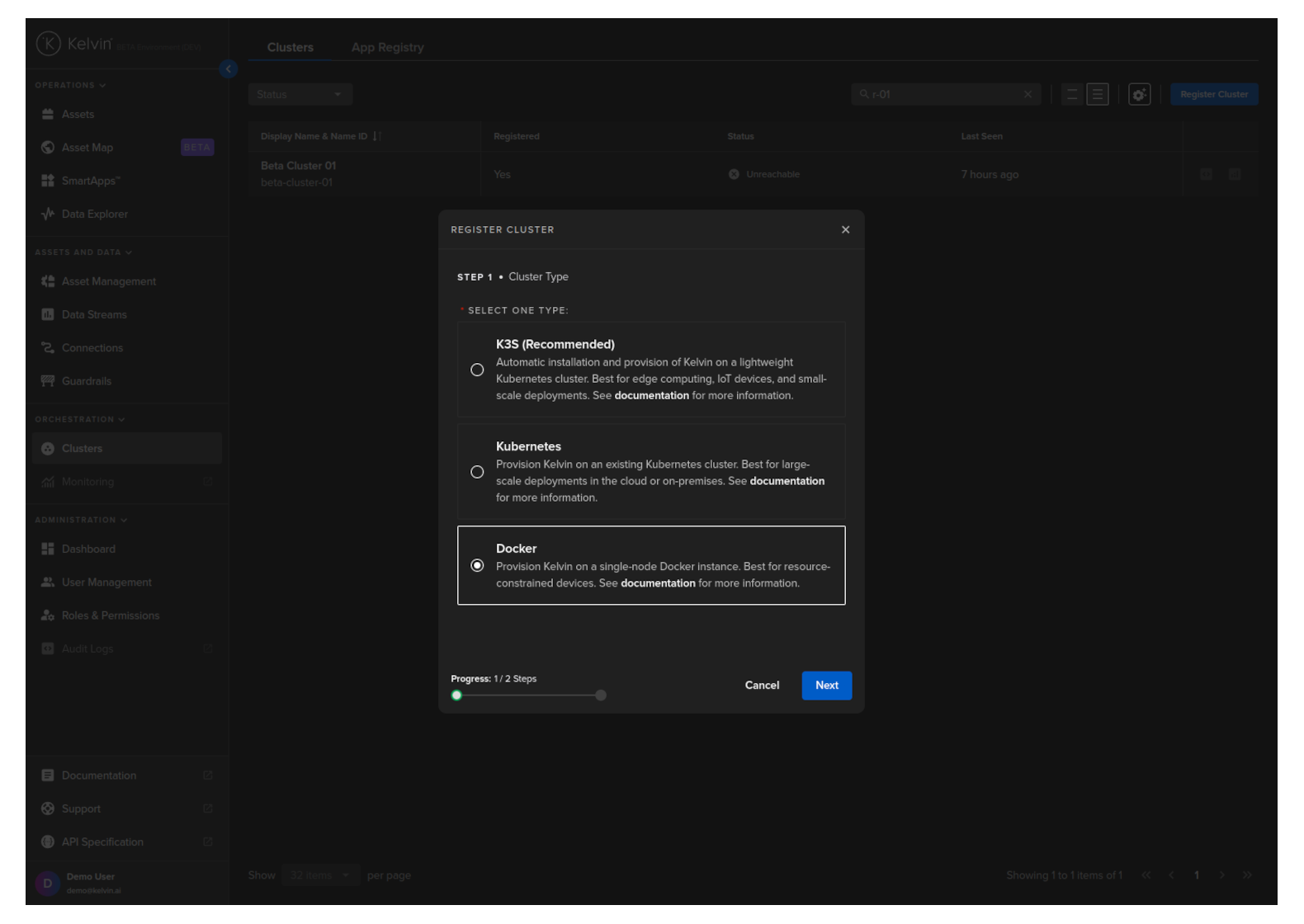 In the popup, at step 1 choose the type of cluster to setup. For this example we will choose the Docker option.