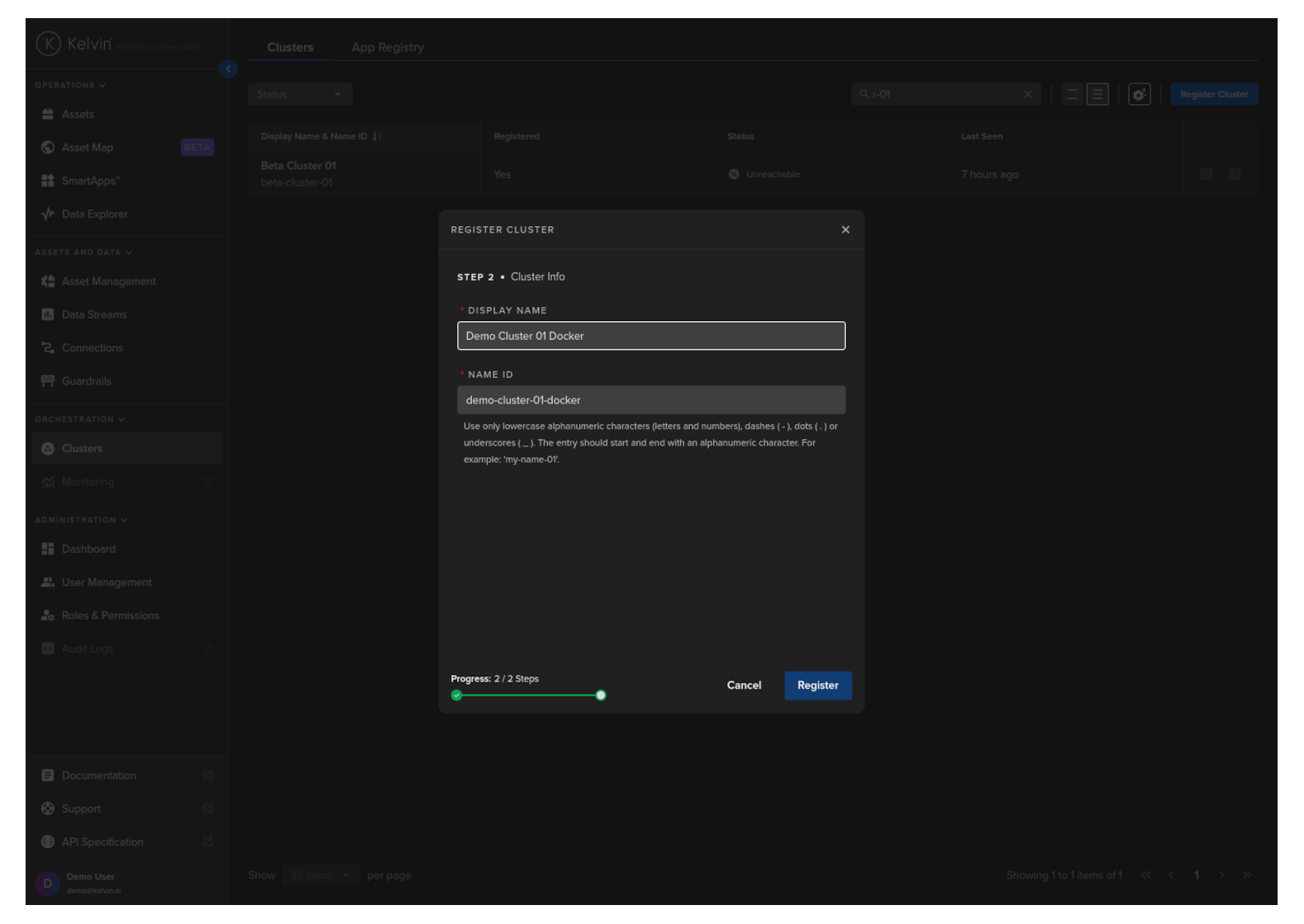 In the Kelvin UI, first head over to the Clusters section under orchestration and click on the register cluster button.