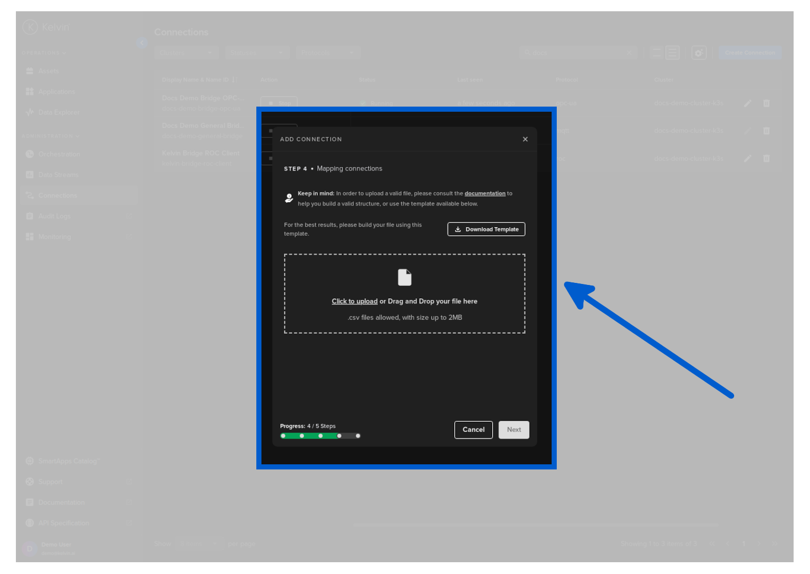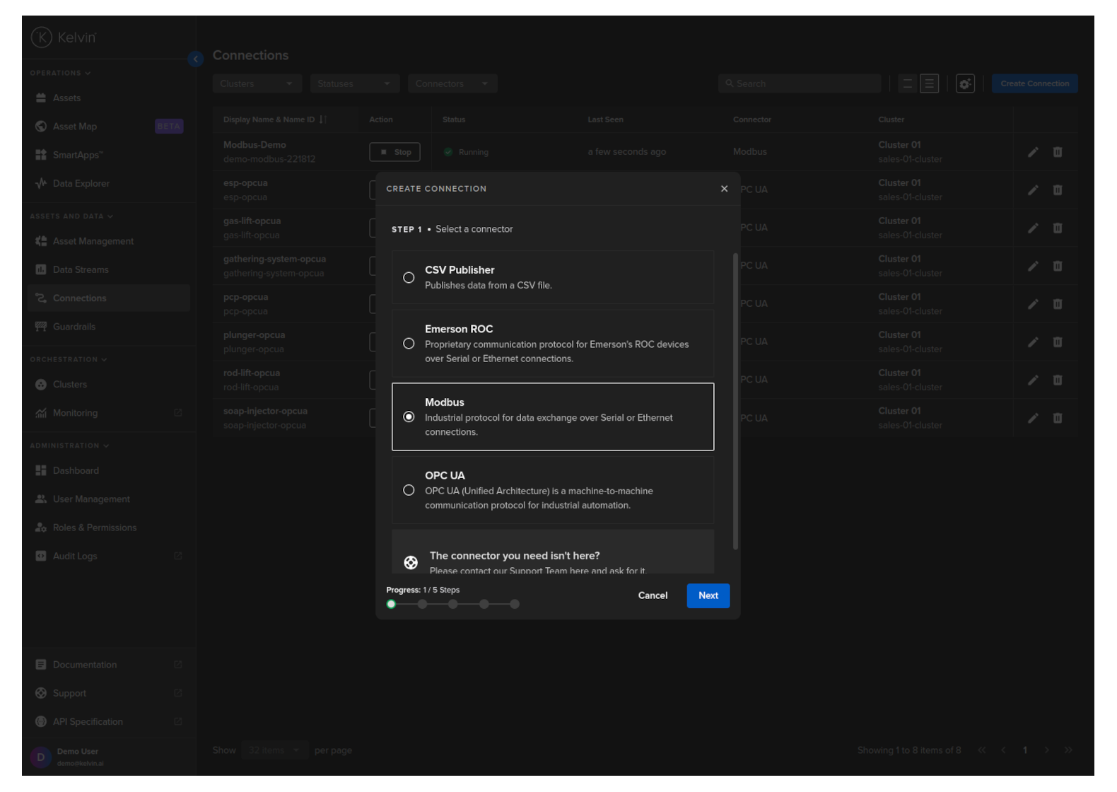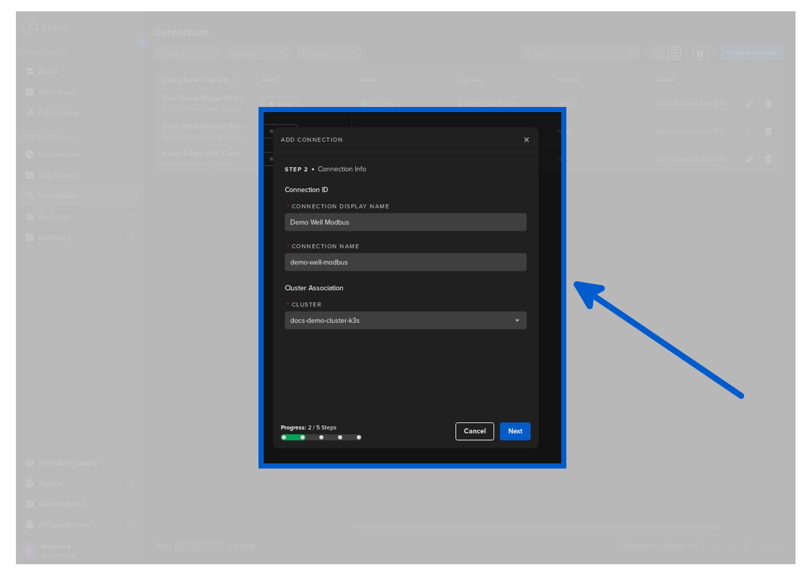 Then in Kelvin UI under Connections you will see your Connection deployed and running.