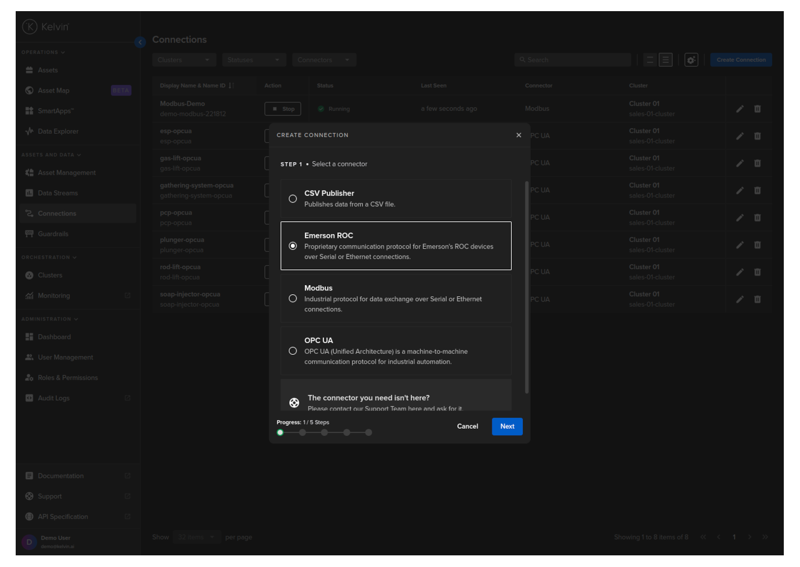You can add an Emerson Operations Controller (ROC) connection through the Kelvin UI, Kelvin SDK and Kelvin API.