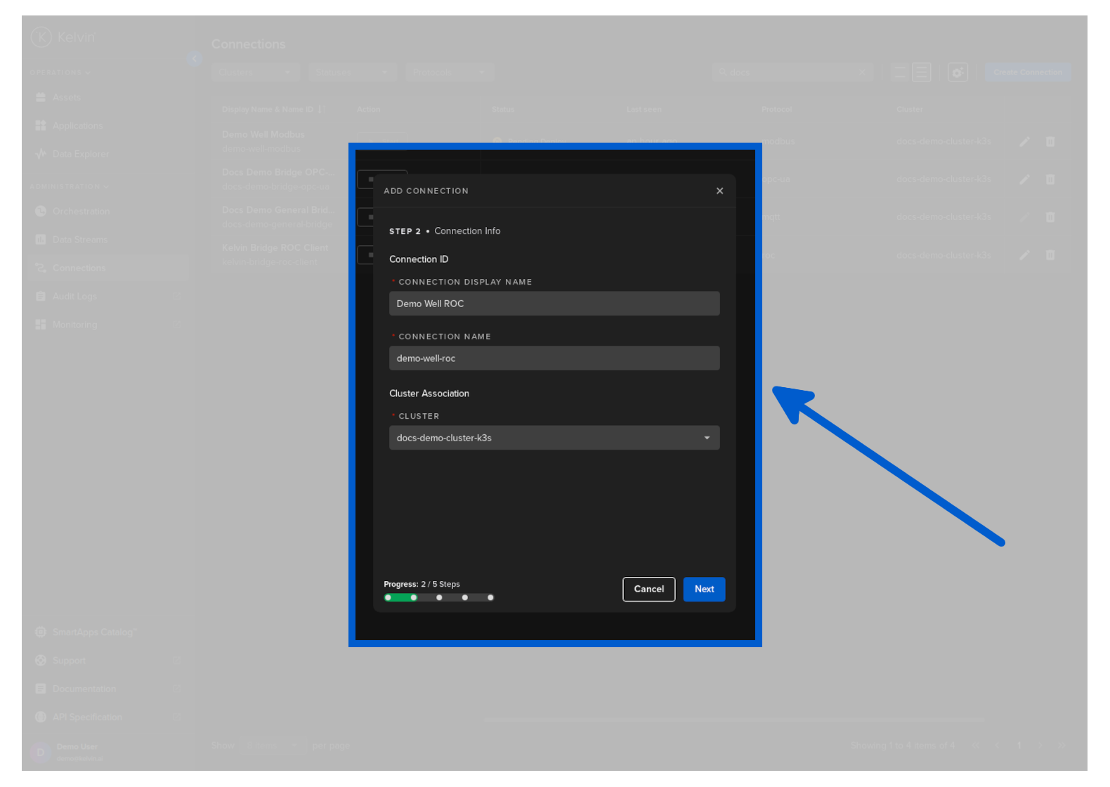Then in Kelvin UI under Connections you will see your Connection deployed and running.